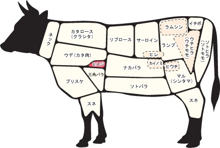 미스지 ミスジ: 견갑골 안쪽 우데(카타 고기)의 일부로, 한 마리 소에서 불과 1kg 나오는 고급 부위다. 잎 모양을 하고 있다. 한국의 부채살과 비슷하지만 조금 더 좁은 부위 같다. 견갑골 안쪽 살이라서 별로 움직이지 않기 때문에 부드럽다. 녹아내릴 듯한 독특한 식감을 즐길 수 있다. 우데 부위 중 가장 고급으로 살짝 구워 먹으면 맛있다. (출처: https://www.eshop-hiro.com/user_data/p_misuji.php)