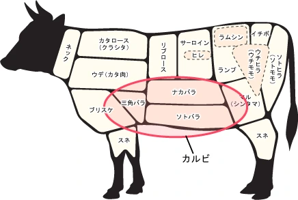 카루비 カルビ(갈비): 일본에서는 바라니쿠 ばら肉라는 부위다. 한국의 '갈비'에서 카루비라는 이름을 따왔다. 늑골 근처의 배의 고기 전체를 뜻하며, 일본에서는 이 부위를 몇 개의 부위로 또 나눈다. 크게 나누면 카타바라 肩バラ(간사이에서는 마에바라라고도 함)와 토모바라 ともバラ 두 종류다.