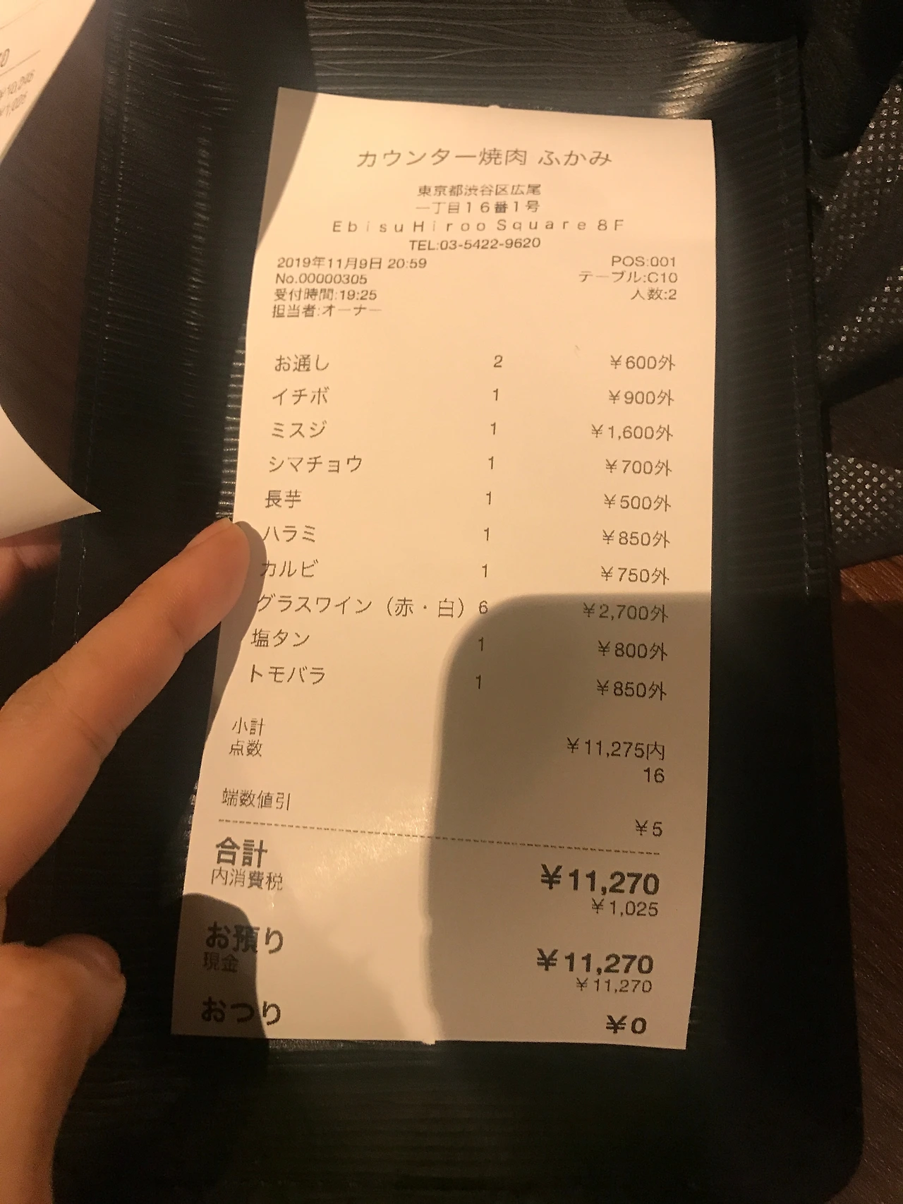 이렇게 소의 희귀한 특수 부위를 잔뜩 먹고도 (+레드 와인 6잔) 이 가격이라니! 가성비가 아주 괜찮은 식사였다. 에비스에서 식사할 일이 있다면 야끼니꾸집을 추천한다.