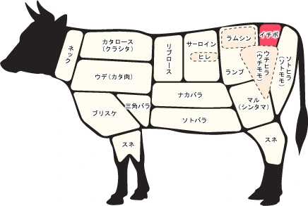 이치보 イチボ(소의 볼기살): 허리 아래 허벅지 살 중 일부로 소의 엉덩이뼈가 H-bone이라고 불리는 데에서 이름이 유래했다. 마블링이 사악 껴서 부드러우면서도 쫄깃하다. 소에서 약 2kg만 나오는 고급 부위다. (출처: https://www.eshop-hiro.com/user_data/p_ichibo.php)