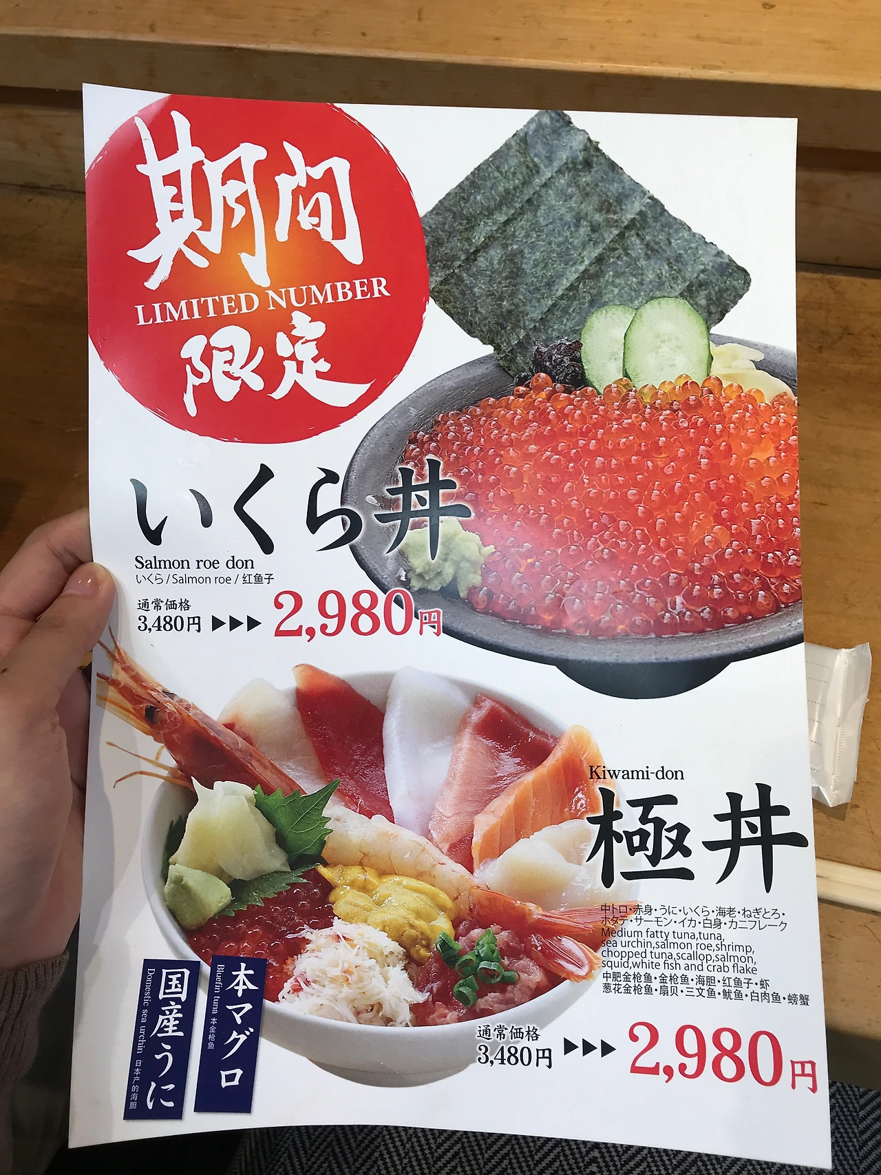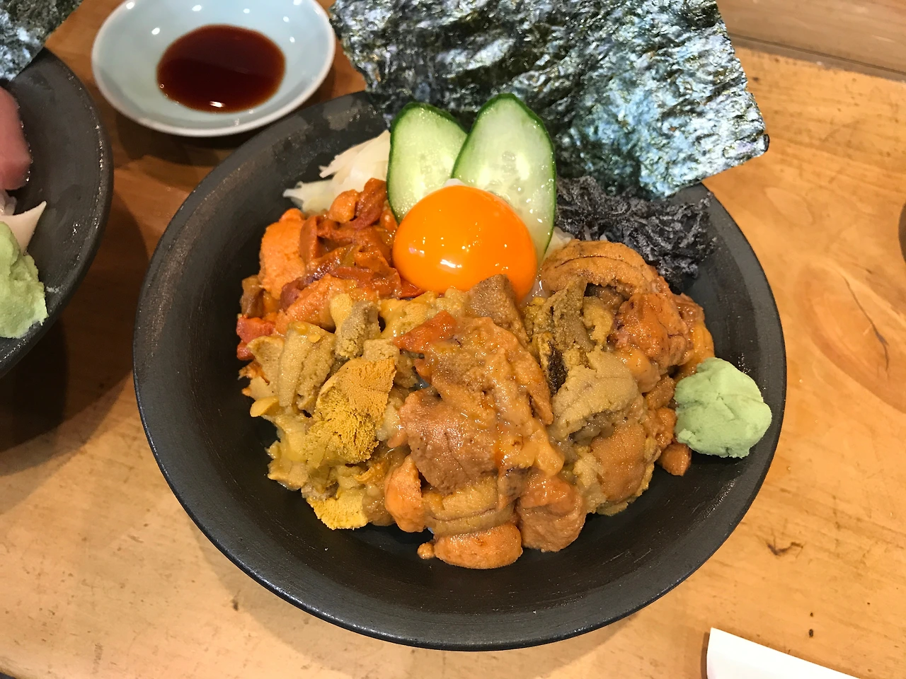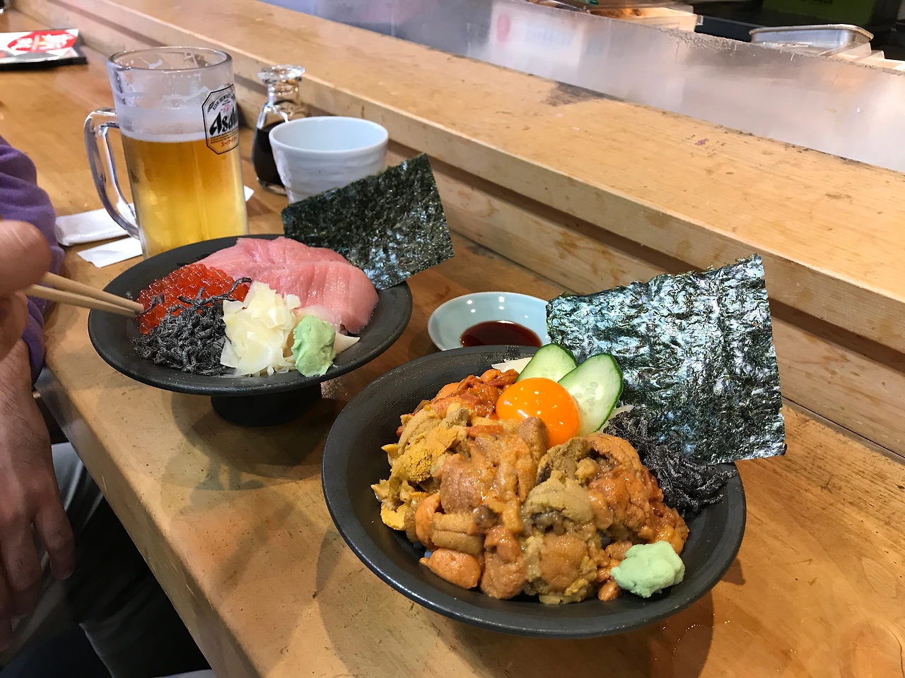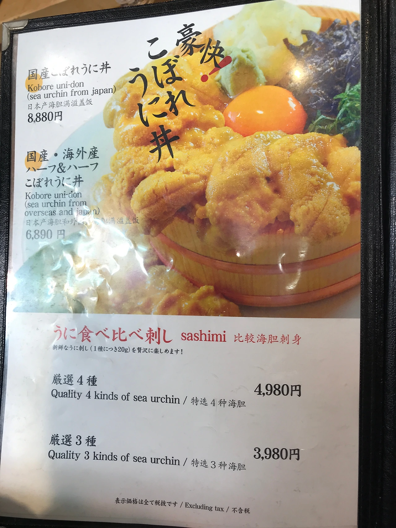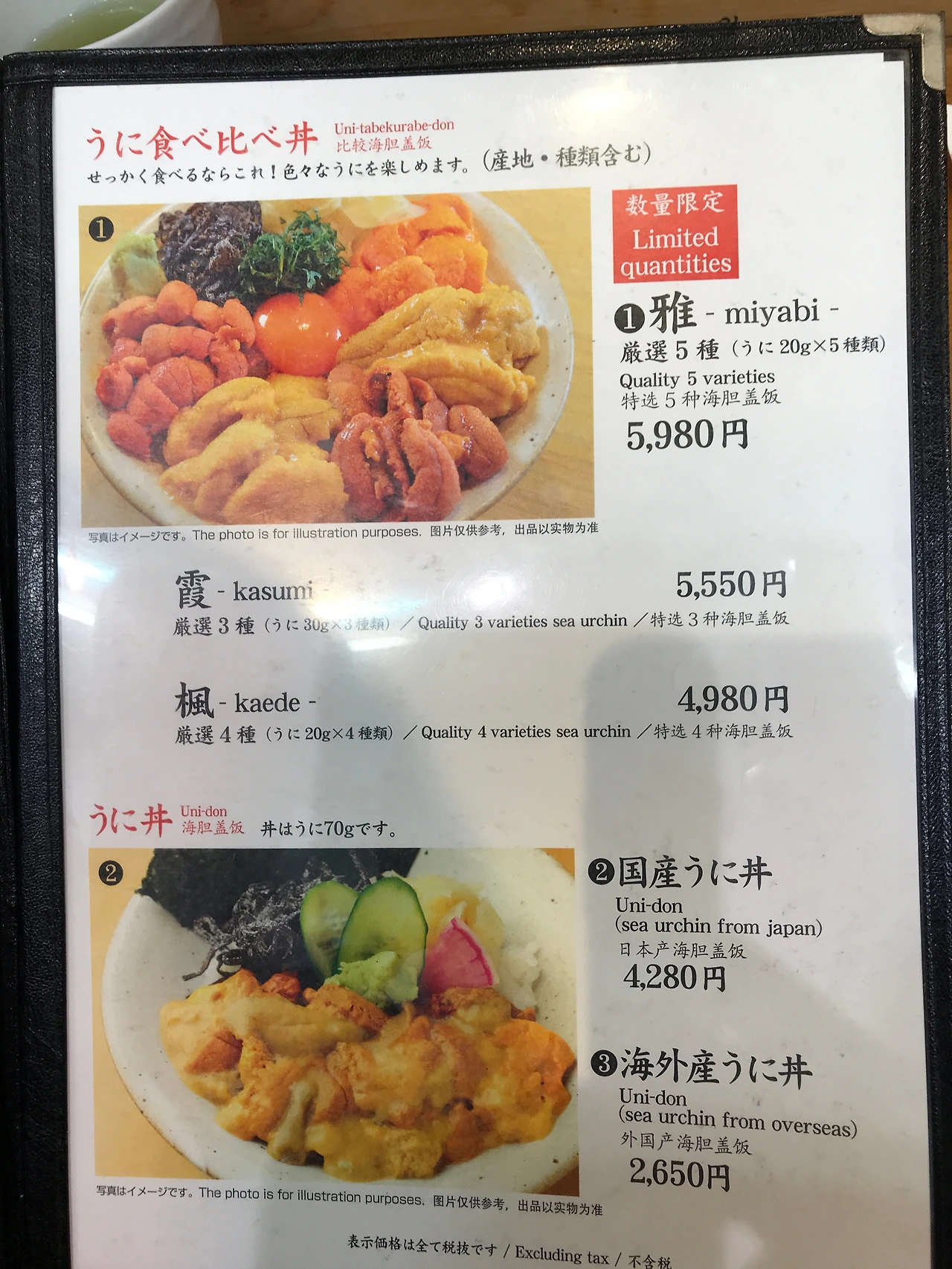 우리는 5가지 산지의 우니를 맛보며 비교할 수 있는 미야비 우니동(5980엔)과 쥬도로와 이쿠라동(2980엔)을 주문했다. 우니동은 가격이 아주 싸진 않지만 그래도 양이 그만큼 사진과 동일하게 많다.