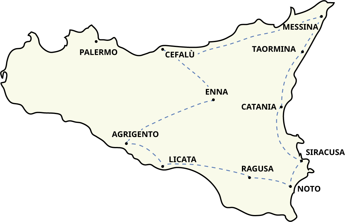 카타니아 CATANIA (2박) – 시라쿠사 SIRACUSA (1박) – 노토 NOTO (점심) – 라구사 RAGUSA (1박) – 리카타 LICATA (점심) – 아그리젠토 AGRIGENTO (1박) – 엔나 ENNA (점심) – 체팔루 CEFALÙ (1박) – 메시나 MESSINA (점심) –타오르미나 TAORMINA (2박) – 카타니아 공항 출국