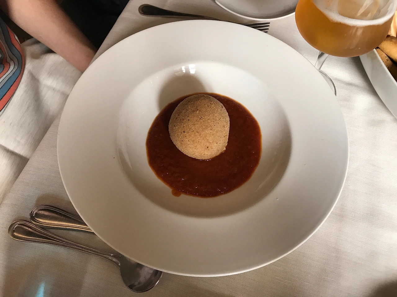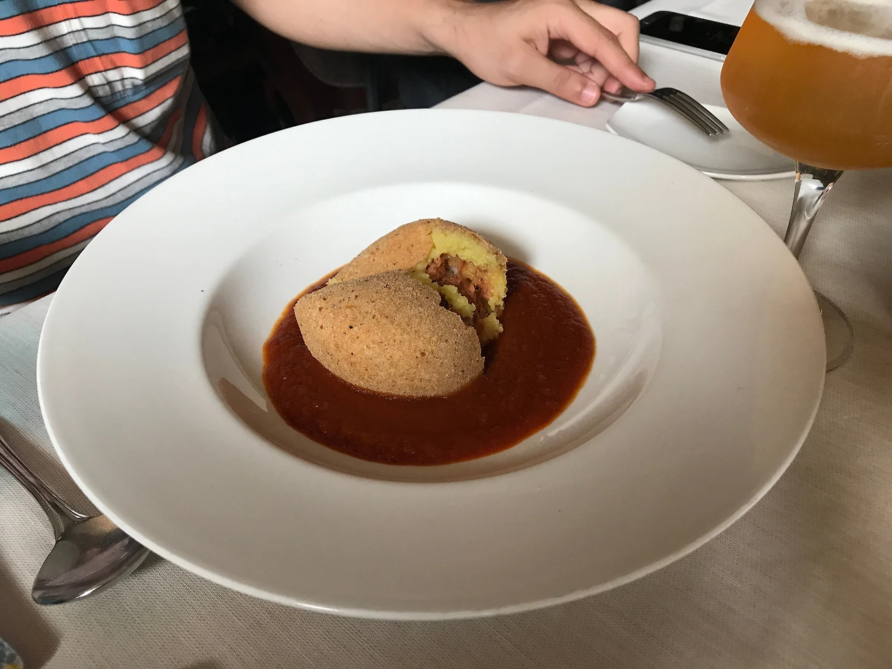 아란치니는 치즈 등을 넣은 리조또를 동그랗게 만들어 튀긴 요리이다. 기본적으로 리조또를 튀기지만 위의 사진에서처럼 그 안에 다른 재료가 함께 들어가기도 한다. 아란치니의 본거지는 노토(Noto)라는 시칠리아 소도시라고 한다. 이탈리아어로 오렌지를 '아란치아(Arancia)'라고 하는데, Arancini는 원래 '작은 오렌지'라는 뜻이다. (이탈리아에서는 어떤 것의 작은 버전을 칭할 때 -ino, -ini라는 어미를 단어 끝에 붙인다.) 작은 오렌지처럼 노릇하고 동그란 모양에서 붙은 이름으로 여겨진다. 한국에서도 최근 몇 년 사이에 현지 이탈리안 음식을 추구하는 이탈리안 레스토랑에서 아란치니를 선보여서 나름대로 인지도를 얻어가는 중이다.