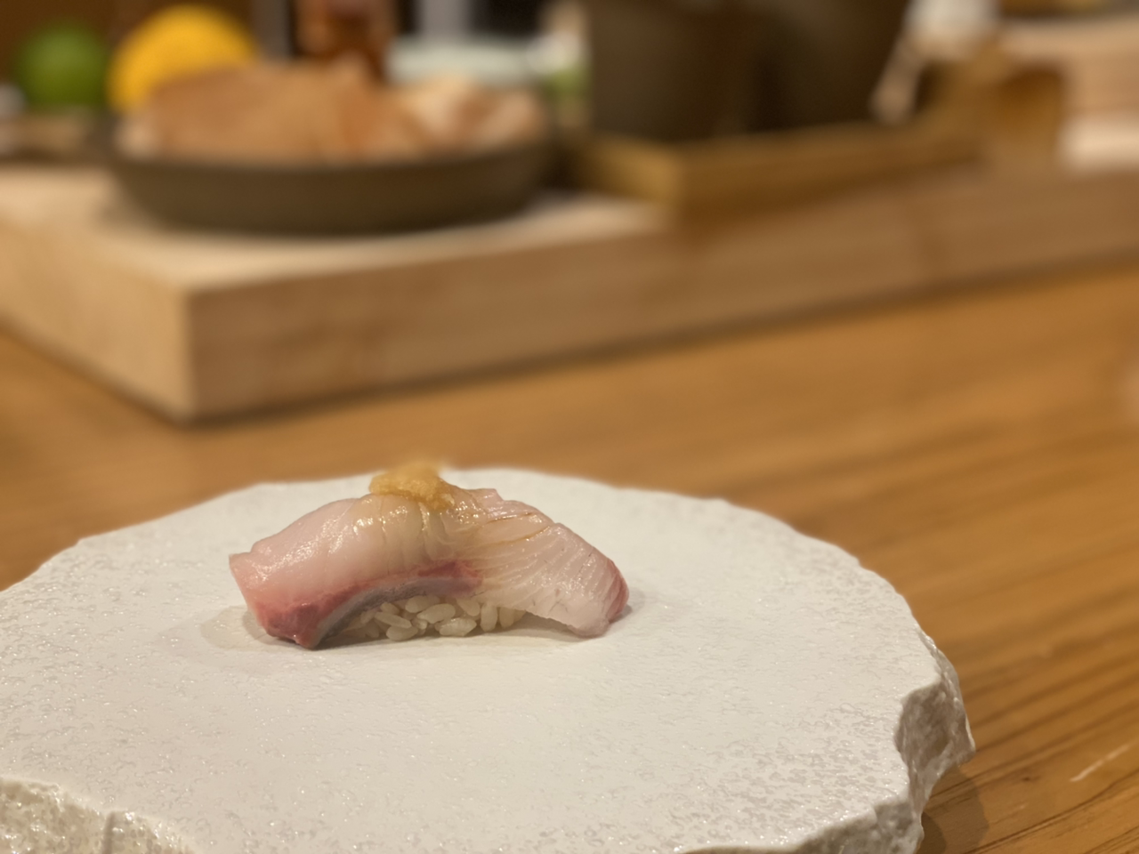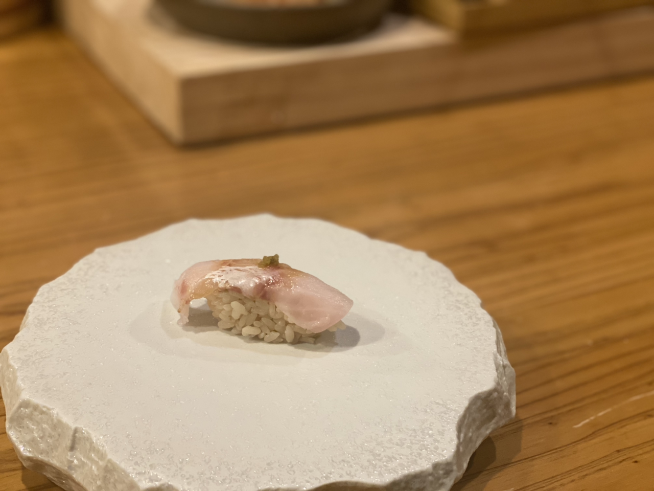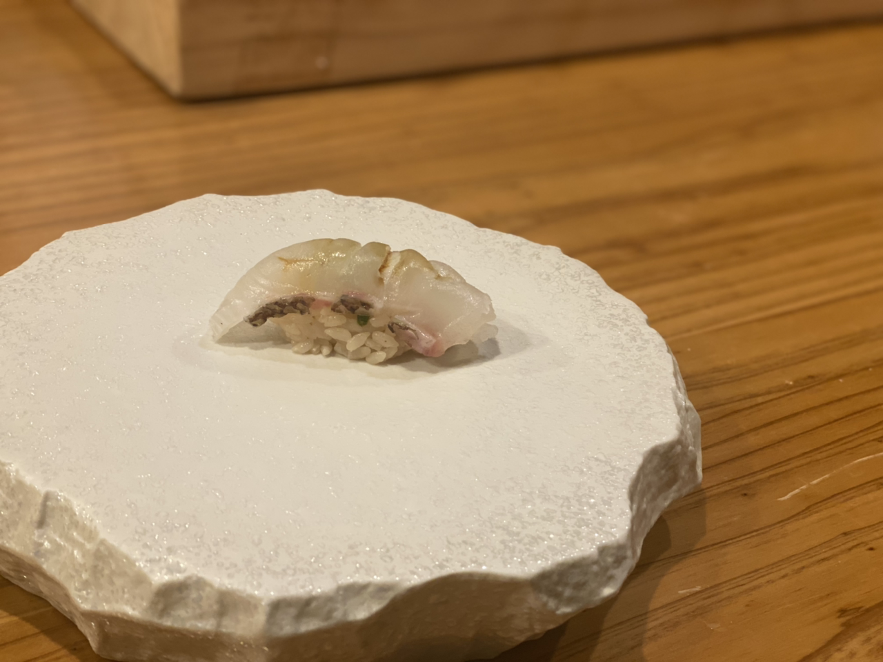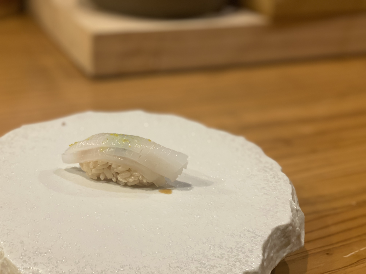 즉석으로 유자 껍질, 제스트를 갈아서 올려주신 한치. 그 위에 짜기보다는 단 맛이 나는 암염도 뿌려졌다. 한치 아래에는 매실과 시소를 절여 만든 다이니꾸가 들어 있다. 상큼하게 입가심을 해주는 피스.