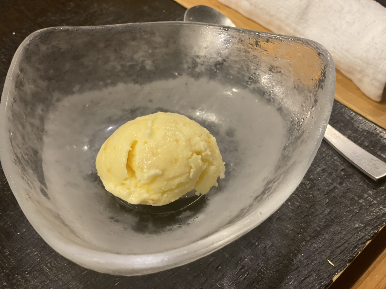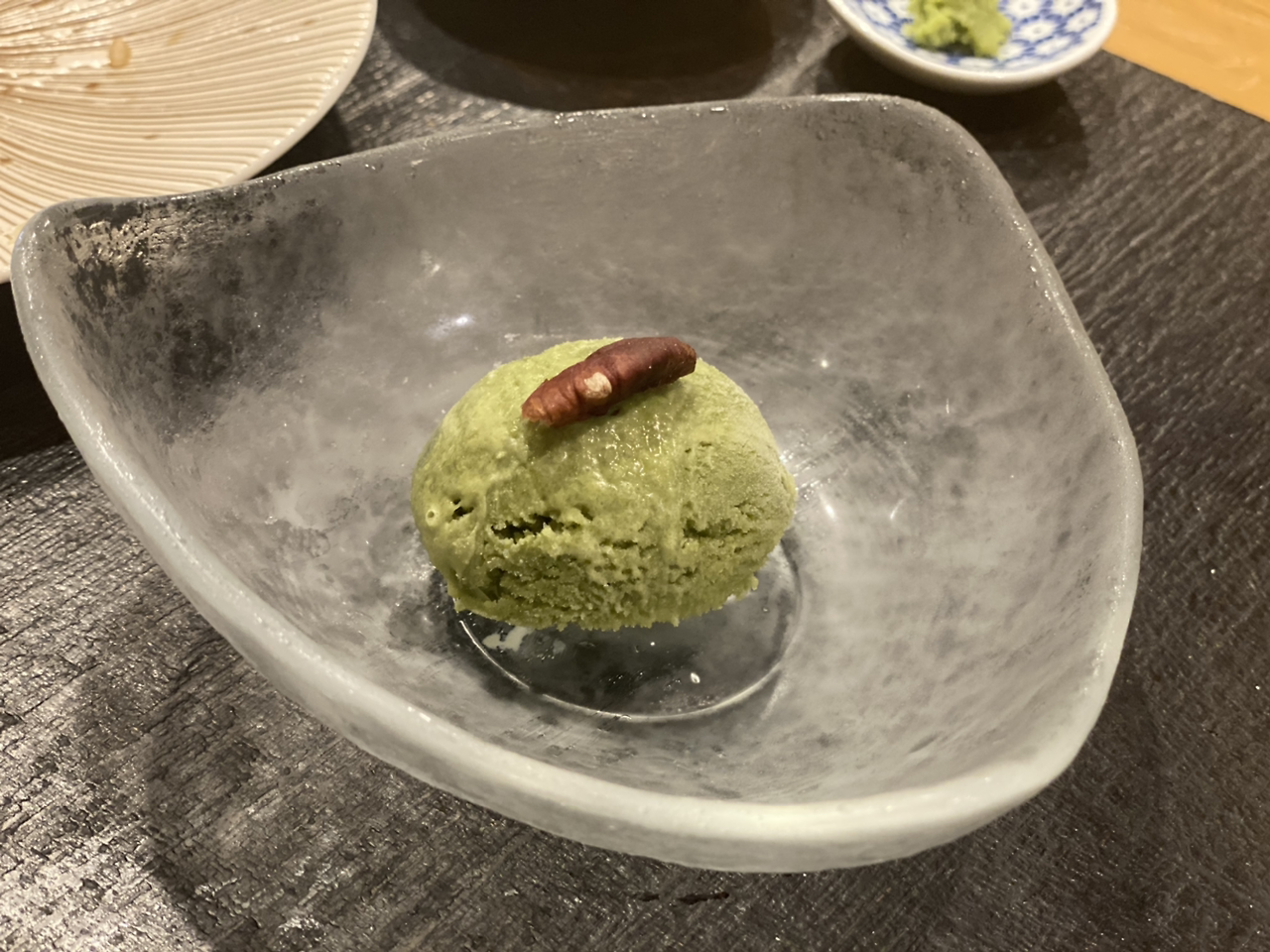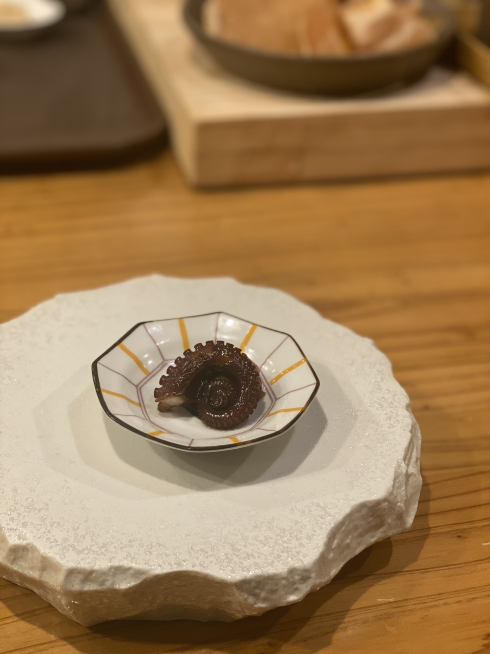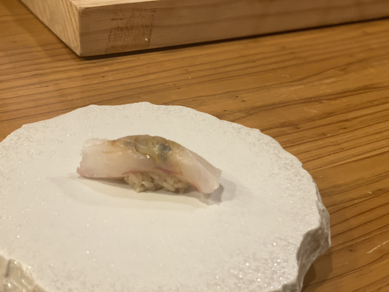 즉석으로 유자 껍질, 제스트를 갈아서 올려주신 한치. 그 위에 짜기보다는 단 맛이 나는 암염도 뿌려졌다. 한치 아래에는 매실과 시소를 절여 만든 다이니꾸가 들어 있다. 상큼하게 입가심을 해주는 피스.
