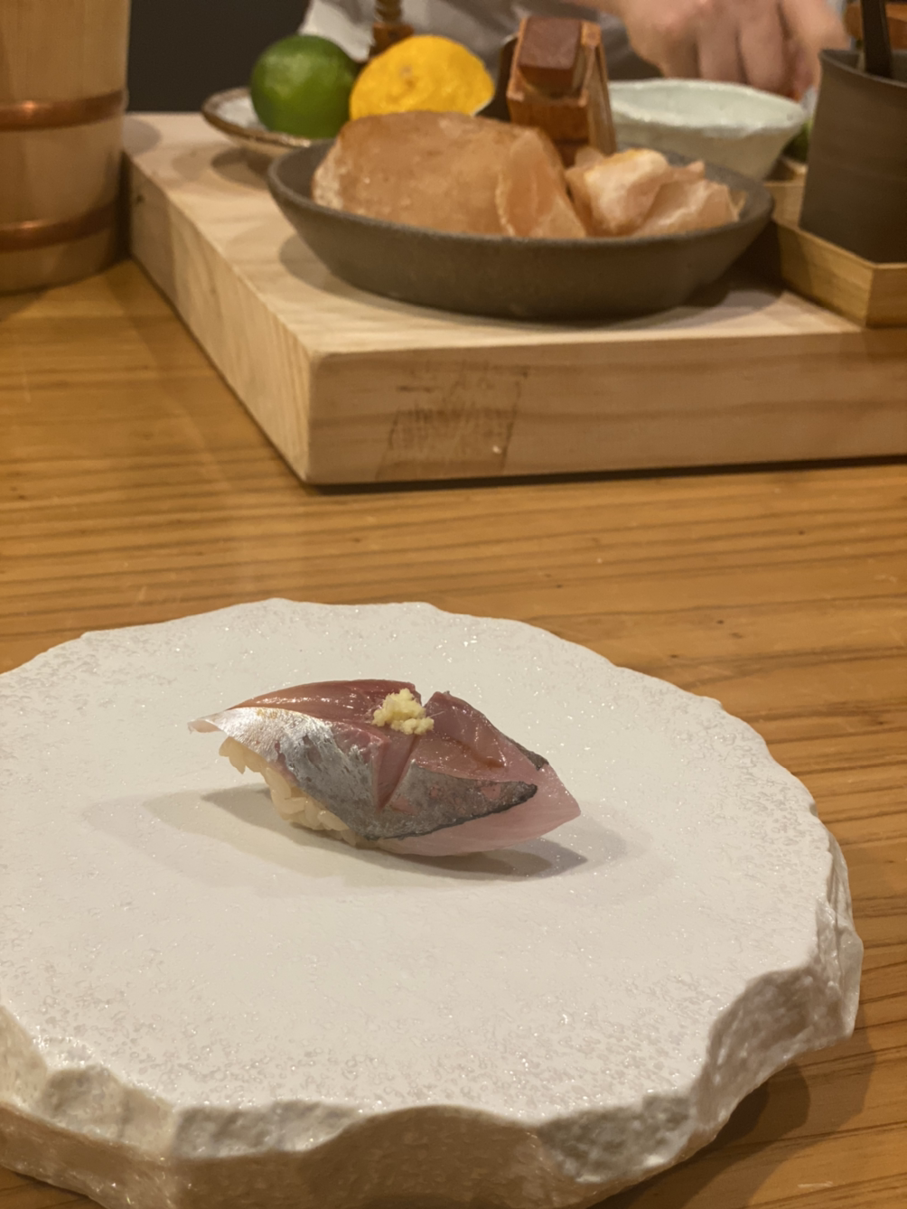 생강을 곁들이면 참 좋은 기름진 전갱이. 이 조합이라면 질리지 않고 몇 피스는 더 집어먹을 수 있을 것 같다.