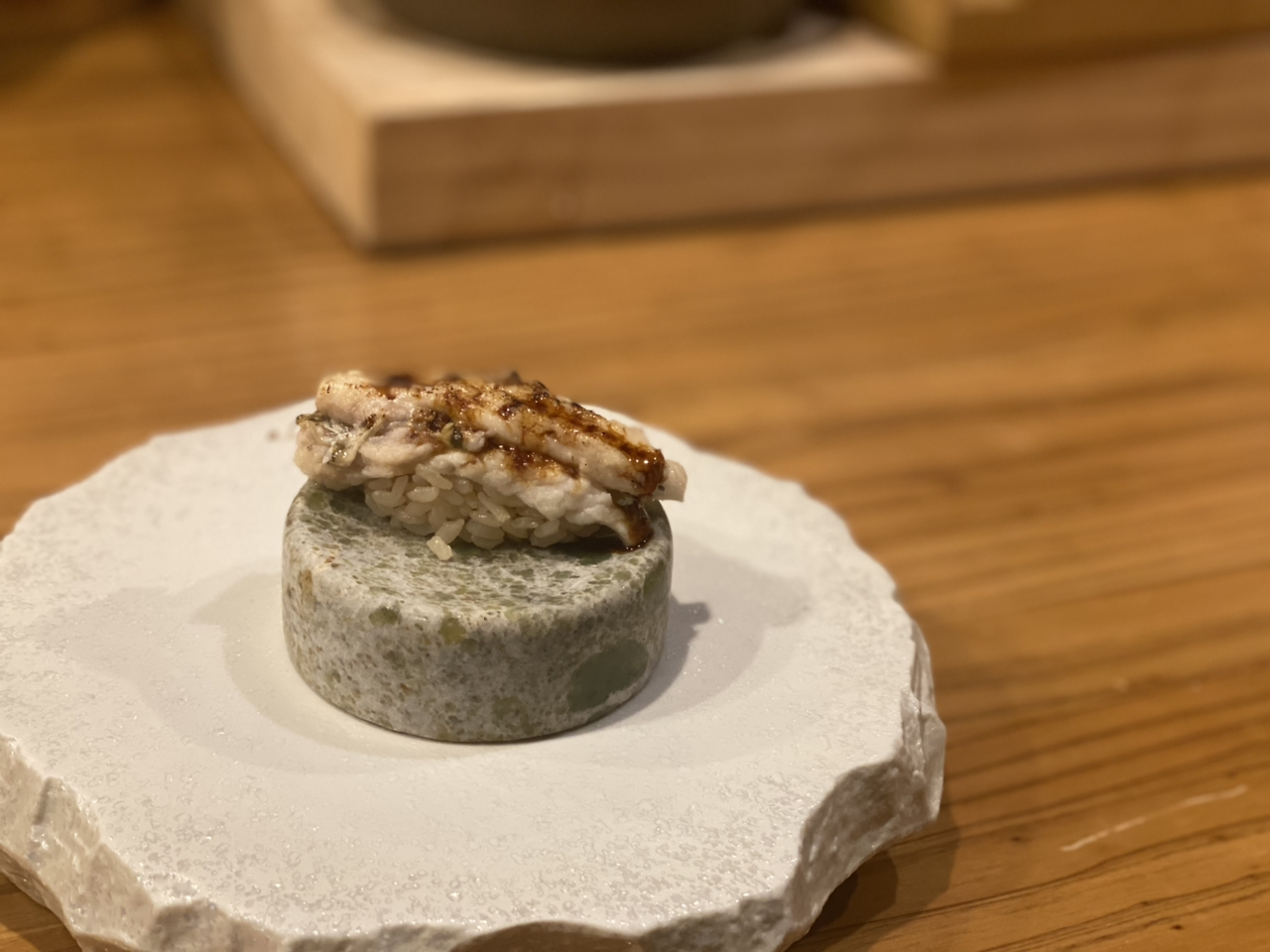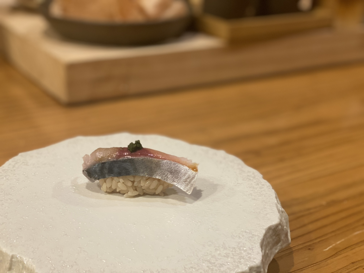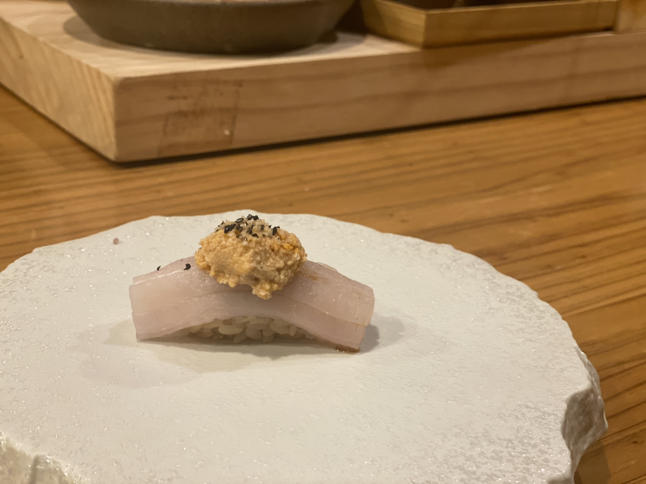 갈치 위에 아귀간(あん肝, 앙키모)을 올리고 그 위에 즉석으로 깨를 갈아서 올려주셨다. 시소까지 곁들여져 향긋하게 아귀간의 느끼함을 잡아주었다.