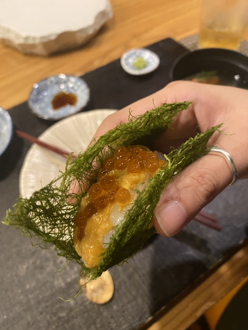 부드럽고 씹는 맛이 있는 쌉쌀한 감태에 성게알, 연어알, 딱새우가 어우러졌으니 뭐, 맛이 없을 수가 없다.