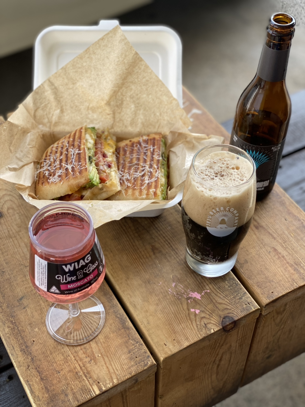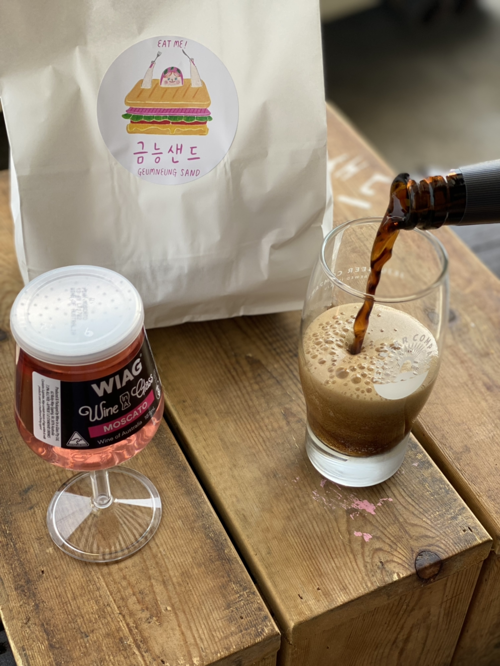 이틀 연속 방문해서 가게 앞 테이블에 앉은 우리. ㅋㅋ 글래스 와인도 화이트, 로제, 레드가 있다. 제주 흑맥주 에일과 로제 모스카토 와인 한 잔이면 피로가 싹 풀린다.