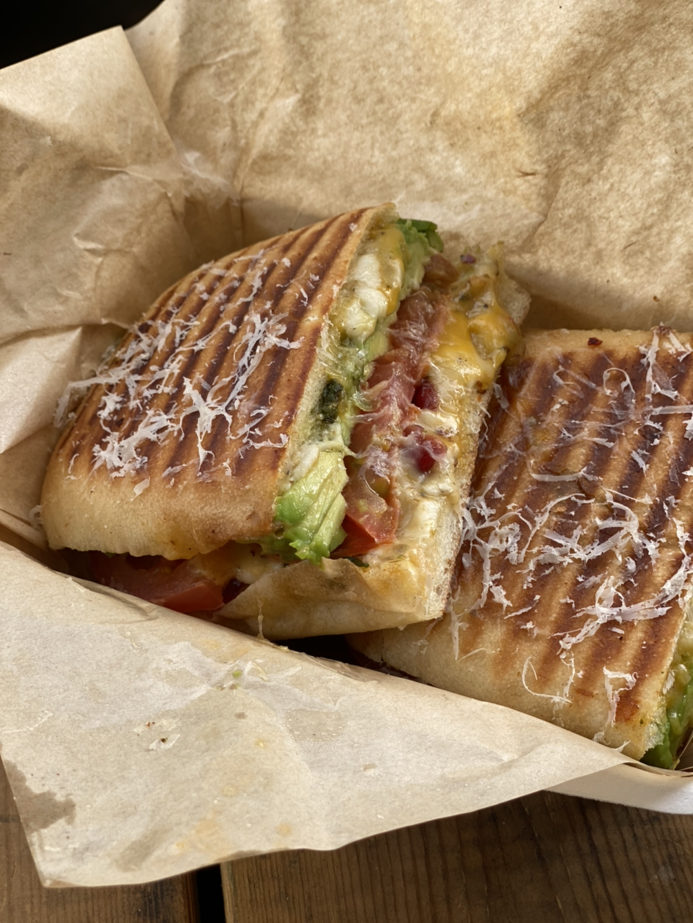 아보카도 빠니니에 이렇게나 실하게 아보카도와 치즈, 야채 등이 가득 차 있다.