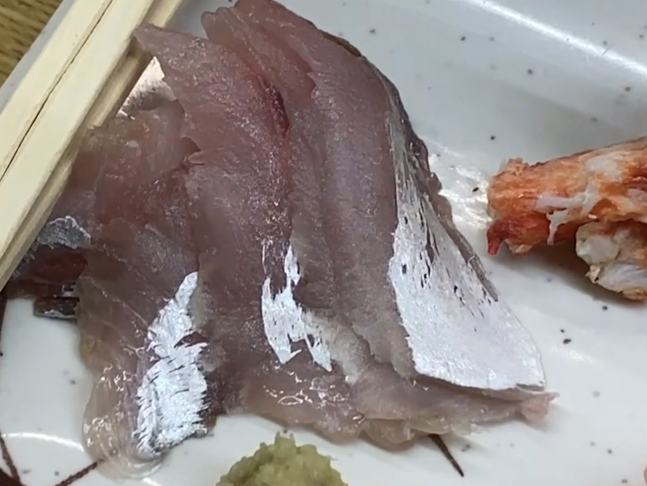 ボタンエビ、クラバガ に、真鯵(真あじ)刺 사시미. 각 360, 400, 360엔.
