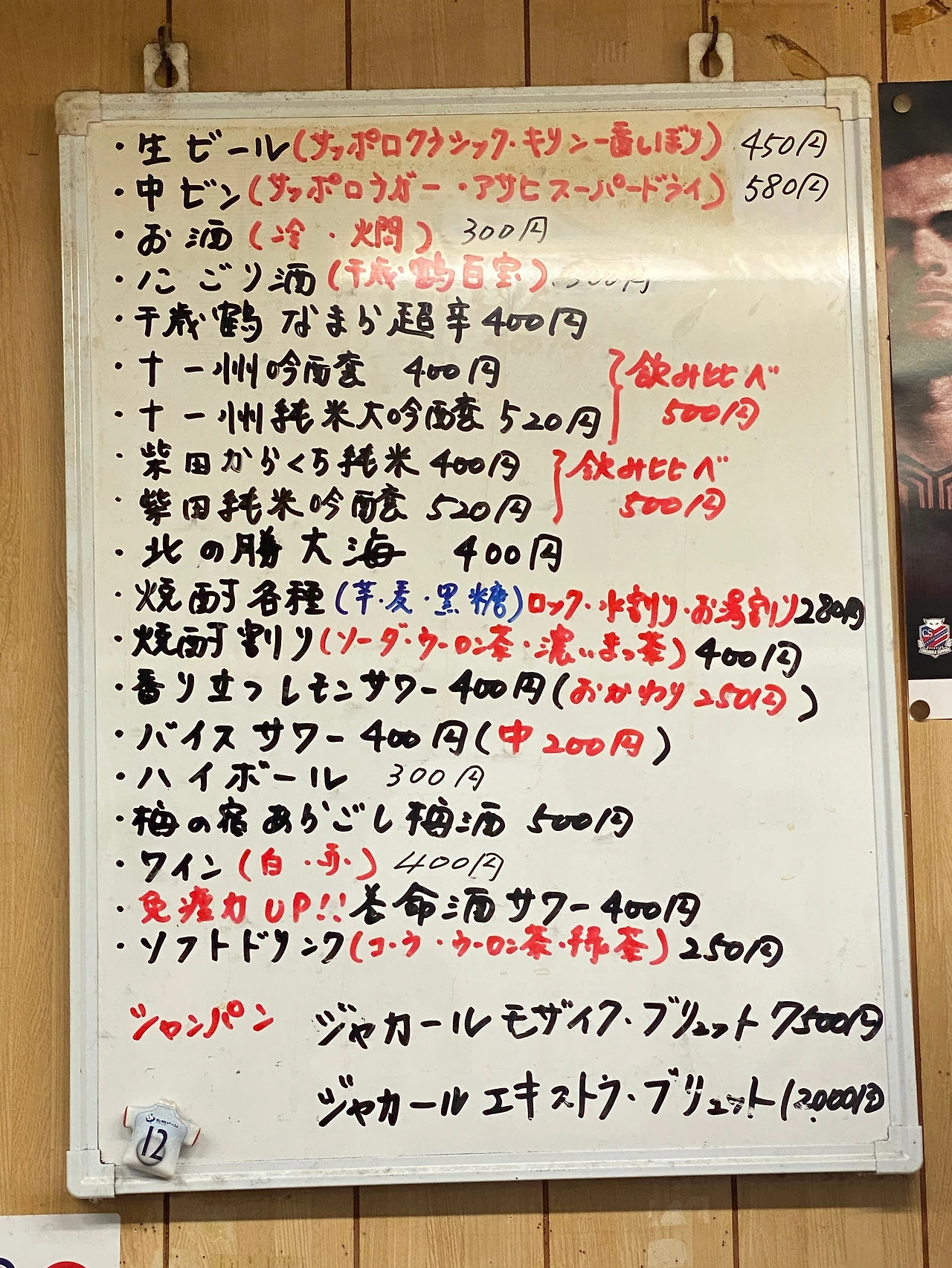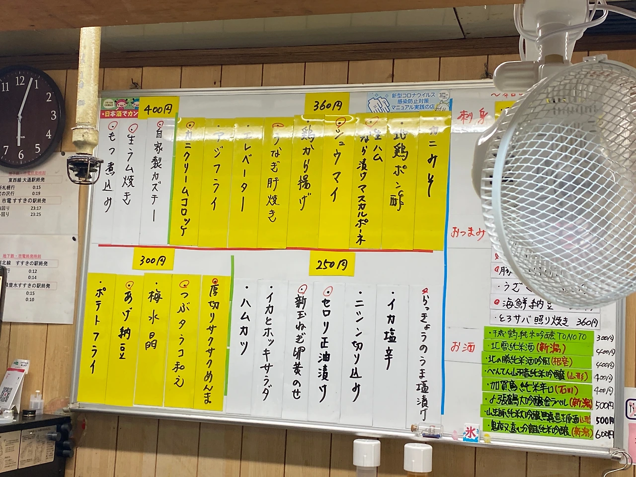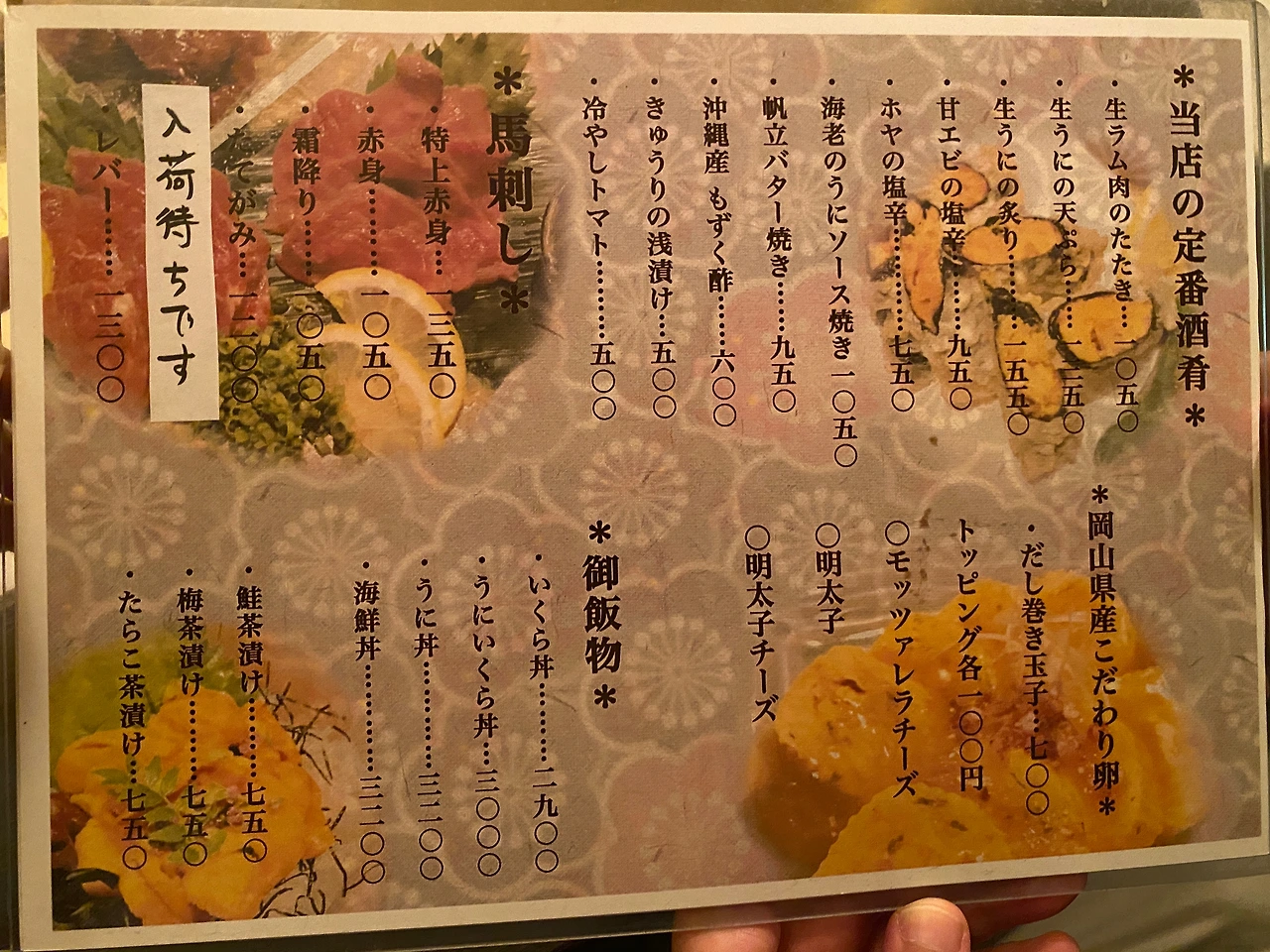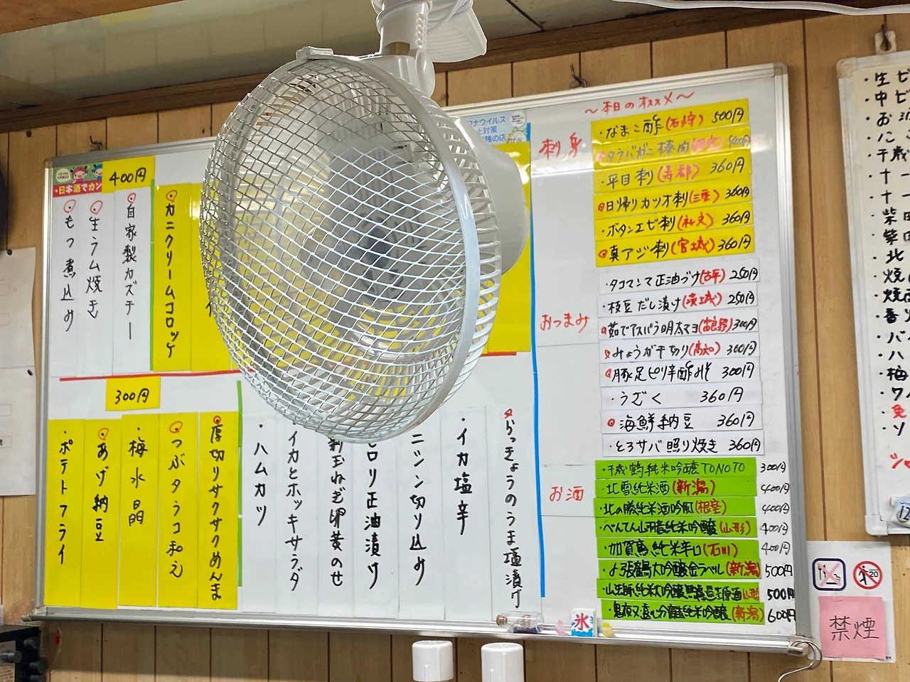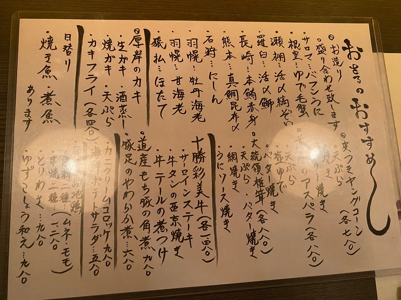 가게의 추천 메뉴. 다양한 사시미와 굴 요리, 홋카이도 야채 요리, 고기 요리 등이 구비되어 있다.