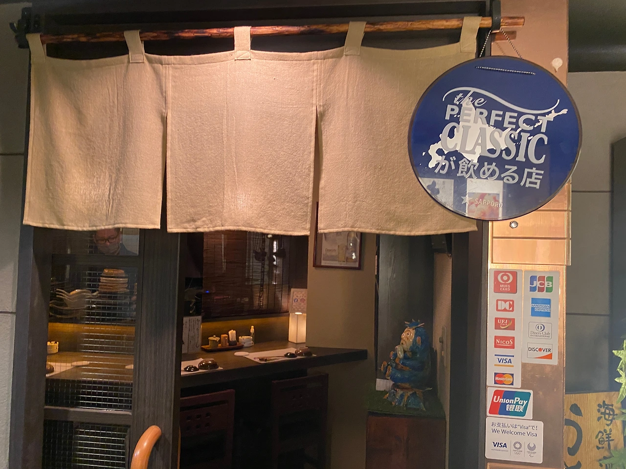 가게 앞에 자랑스럽게 붙어 있는 perfect classic sapporo를 마실 수 있는 가게라는 마크.
