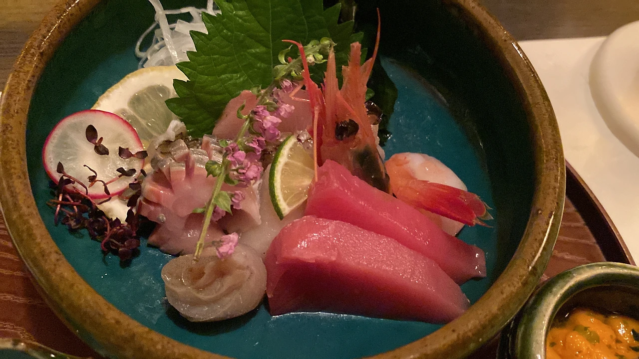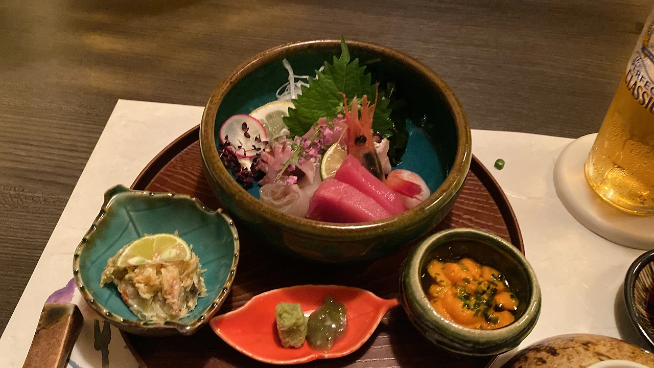 그리고 가게에서 제일 인기 많은 造り盛り合わせ (츠쿠리 모리아와세, 사시미 모둠). 아래쪽에는 오른쪽에 유명한 홋카이도 사로마 지역의 바훈 우니, 왼쪽에는 毛蟹(케가니, 털게).
