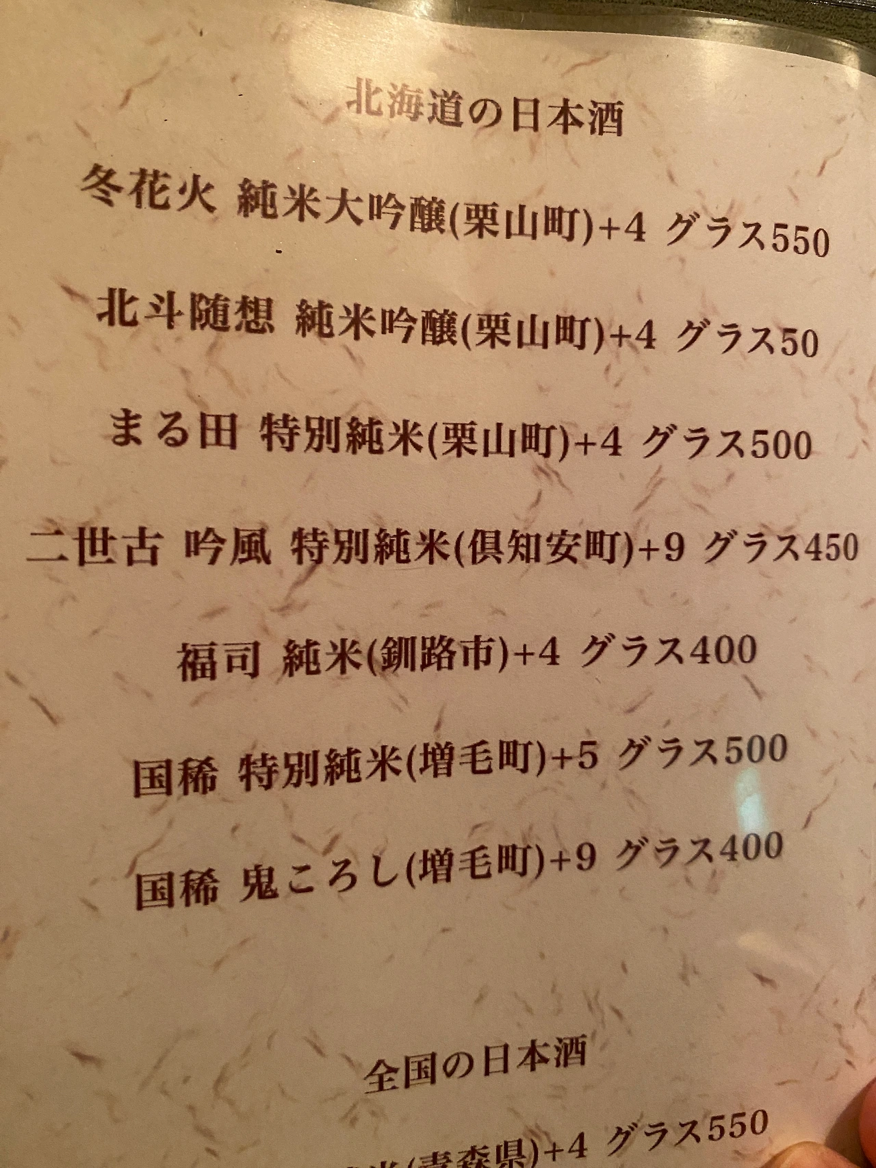 홋카이도의 니혼슈. 이 중에서 깔쌈한 뒷맛을 가진 カラ口 가라구치 사케를 추천받았다.