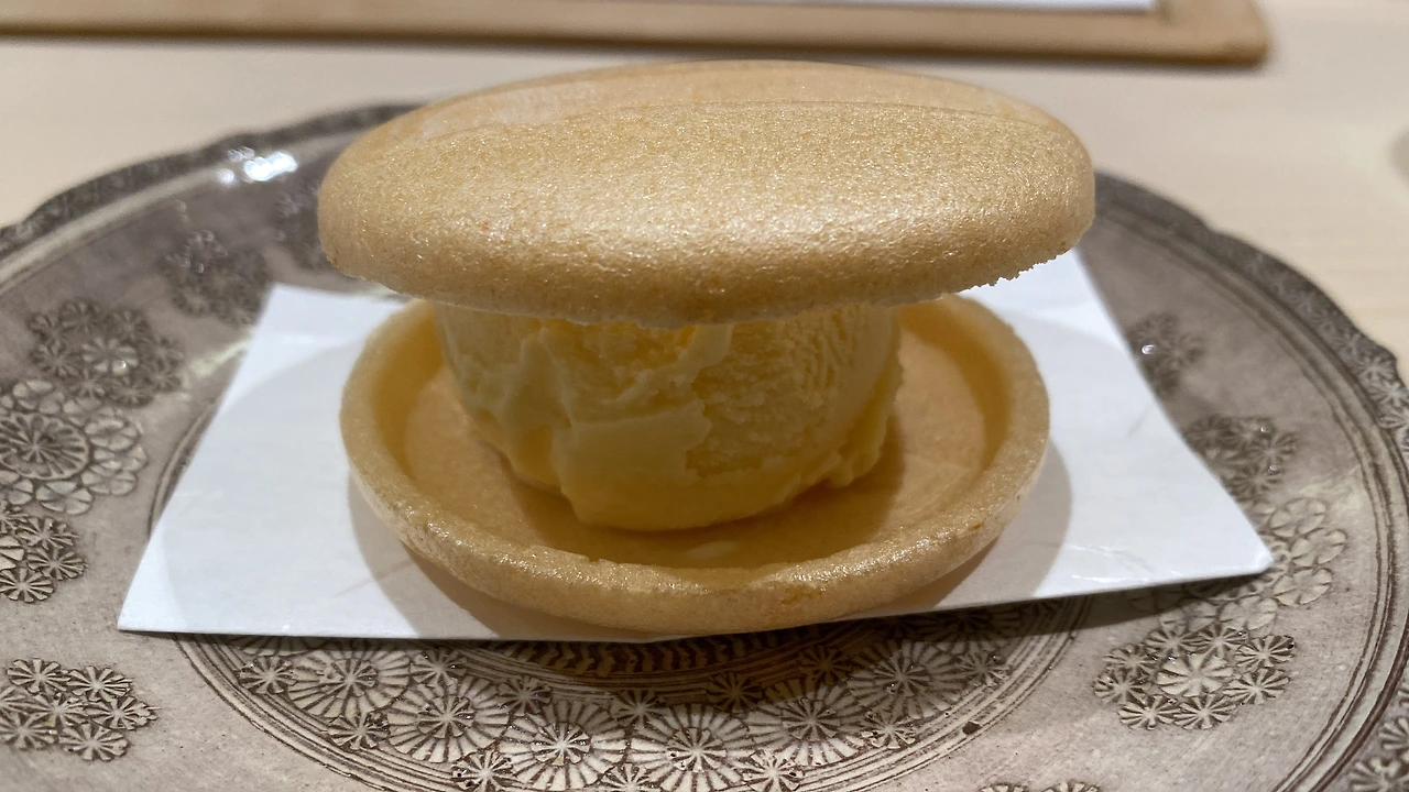 소프트 아이스크림이 450엔, 구워서 누른 떡은 250엔.