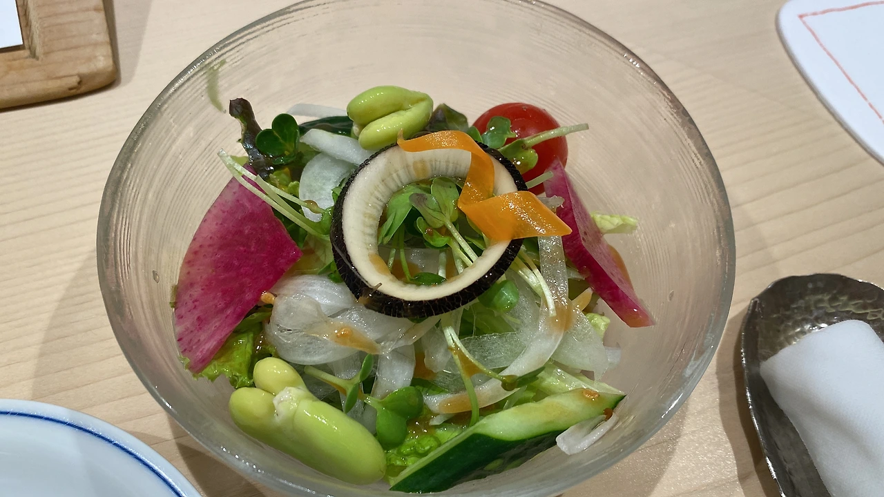 기본으로 나오는 홋카이도 재철 야채샐러드. 아삭아삭 맛있음. 왕따시만 한 콩도 너무 맛있고 빨간 무도 달고 맛있다.