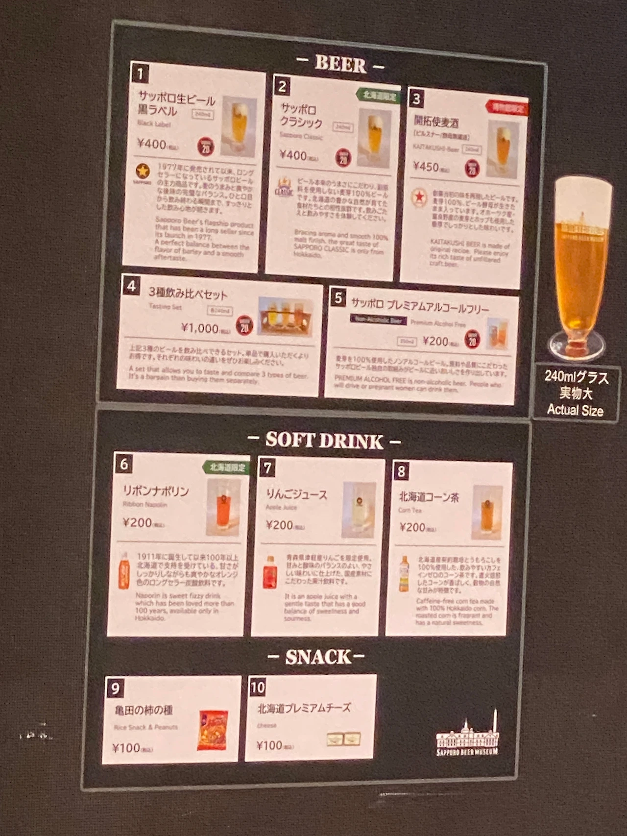여기서는 특별한 가격에 다양한 삿포로 생맥주를 마셔볼 수 있다. (사실 이것 때문에 오는 거임) 근데 이게 라스트오더가 오후 4시까지라서, 맥주 박물관 구경 전에 먼저 시음부터 하러 서둘렀다.