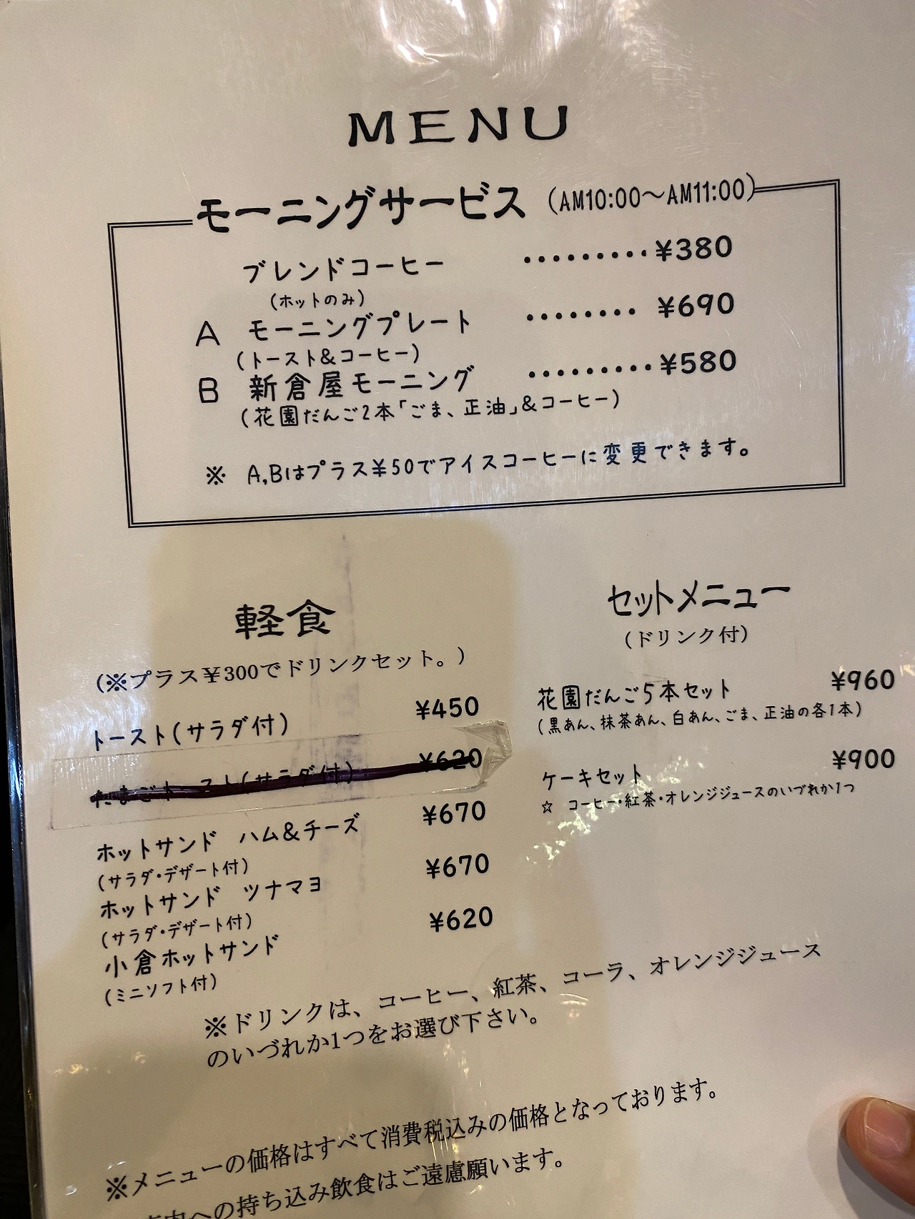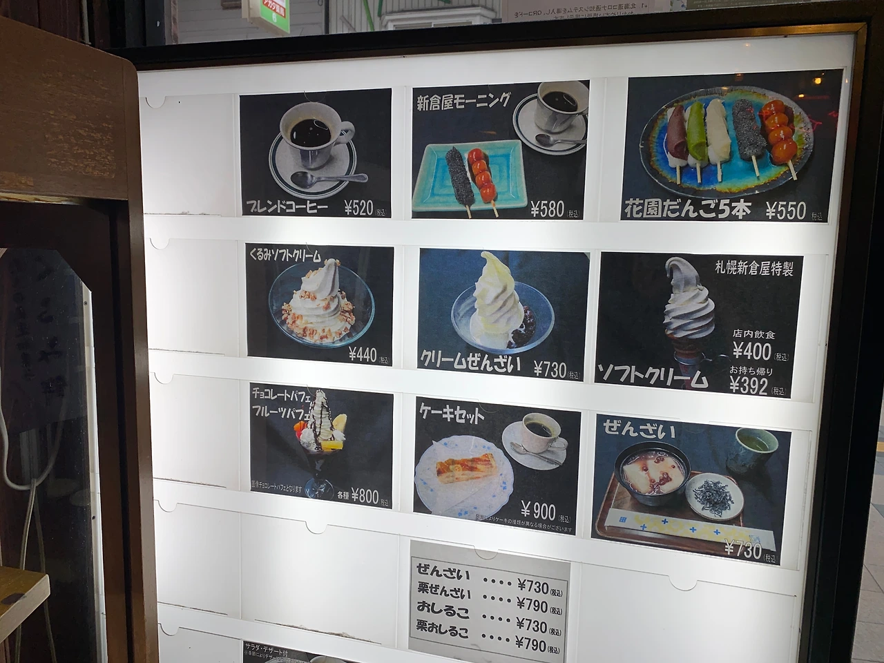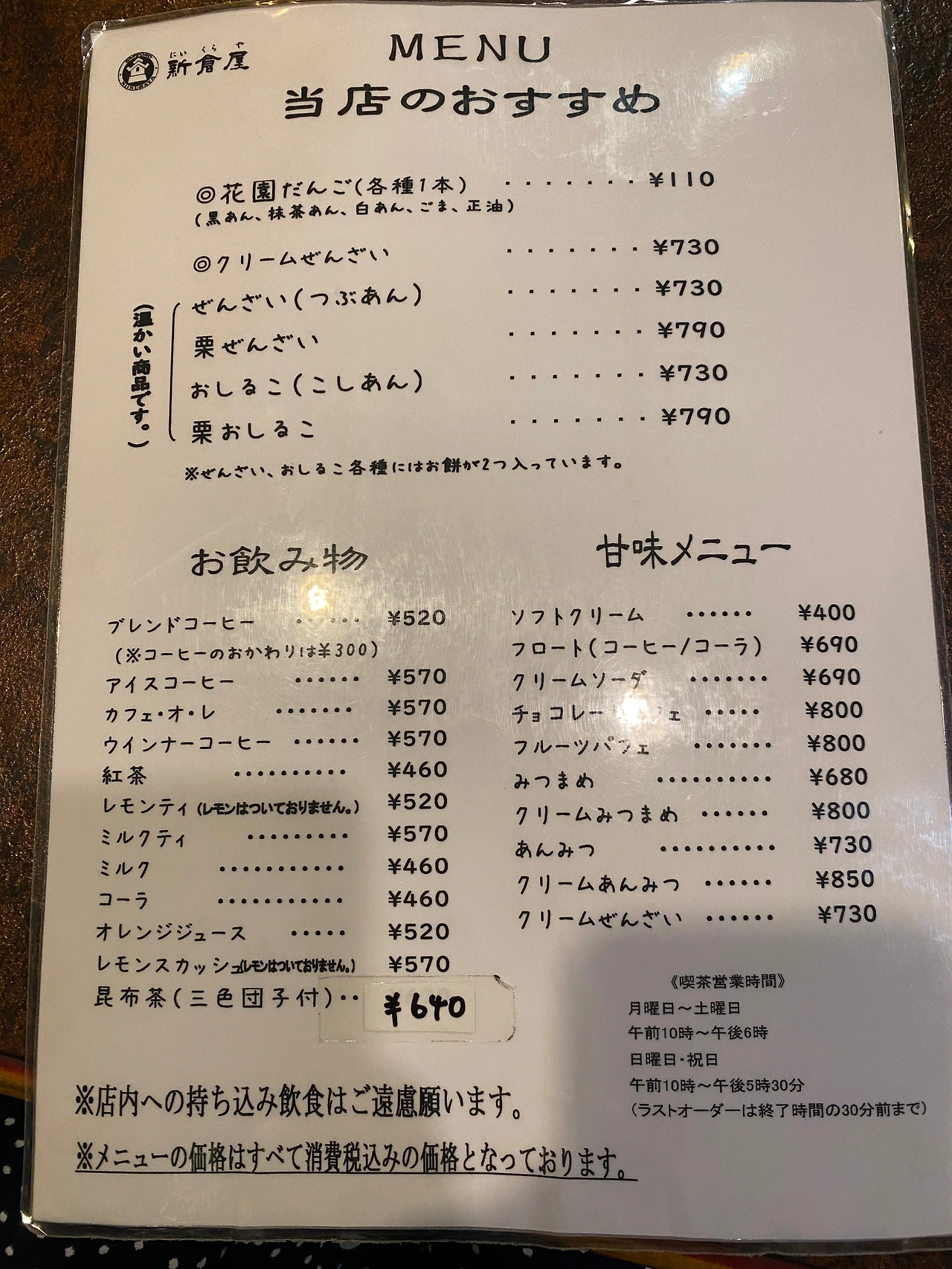 가게의 추천 메뉴에는 당고, 젠자이 등이 포함되어 있다. 오전에는 모닝 서비스 세트도 있음.