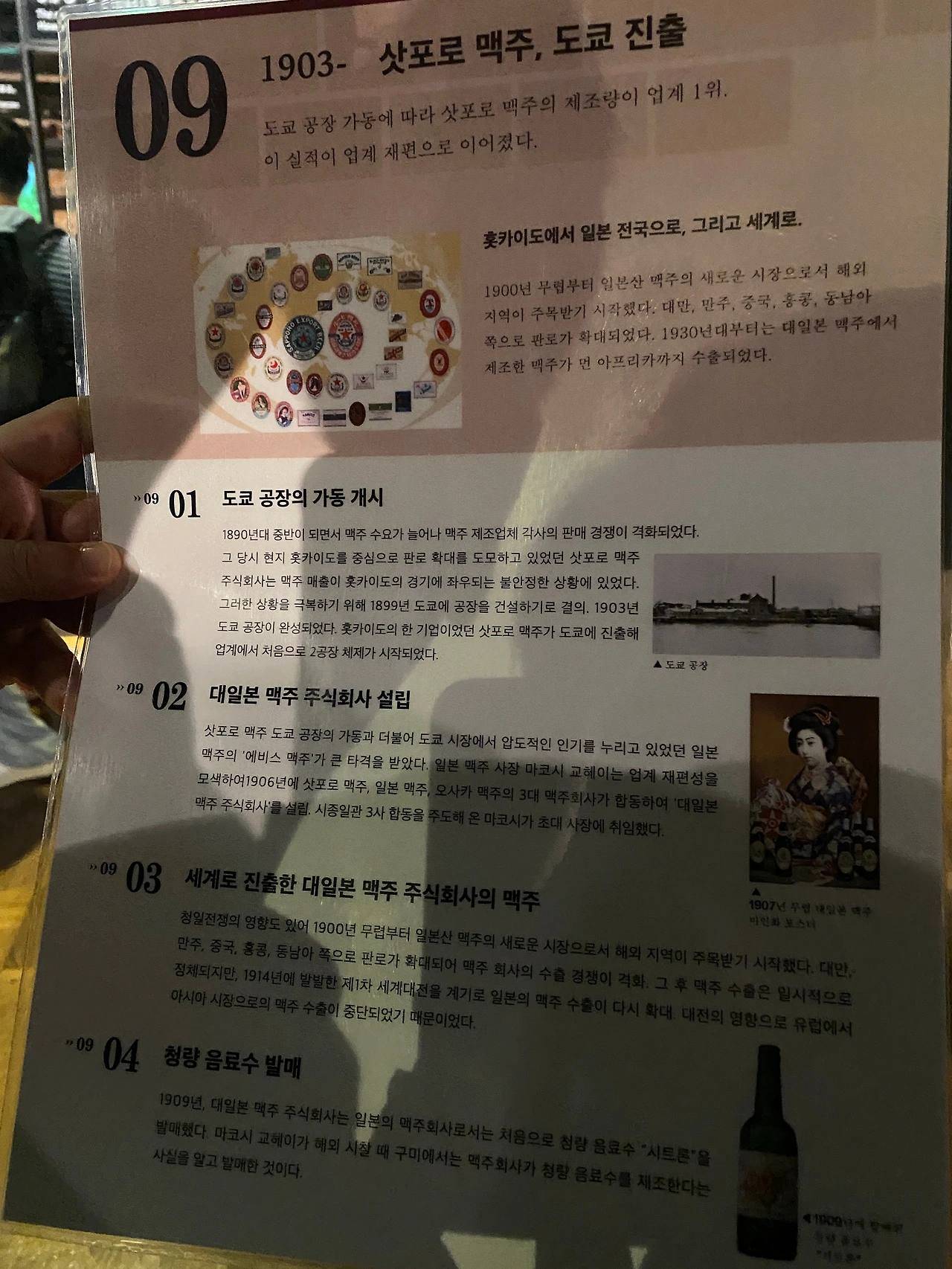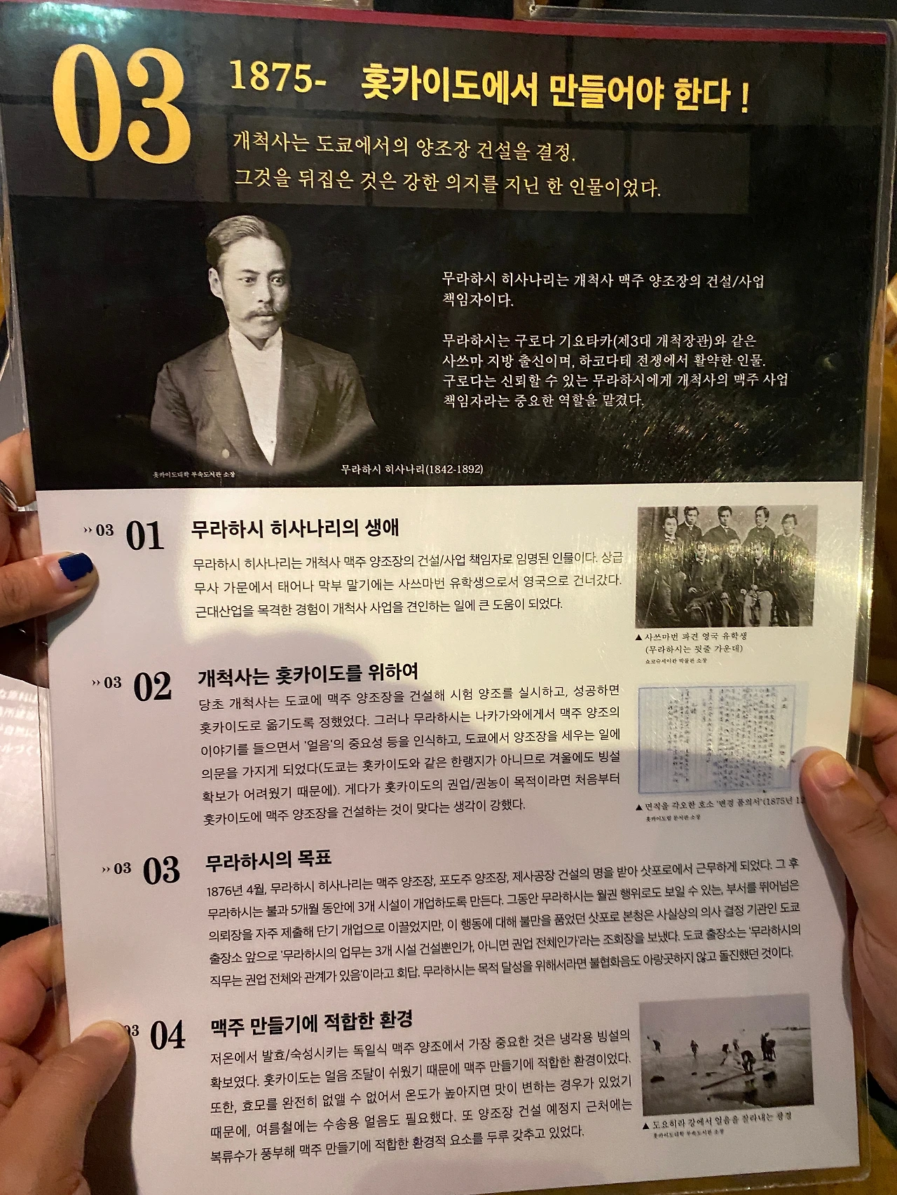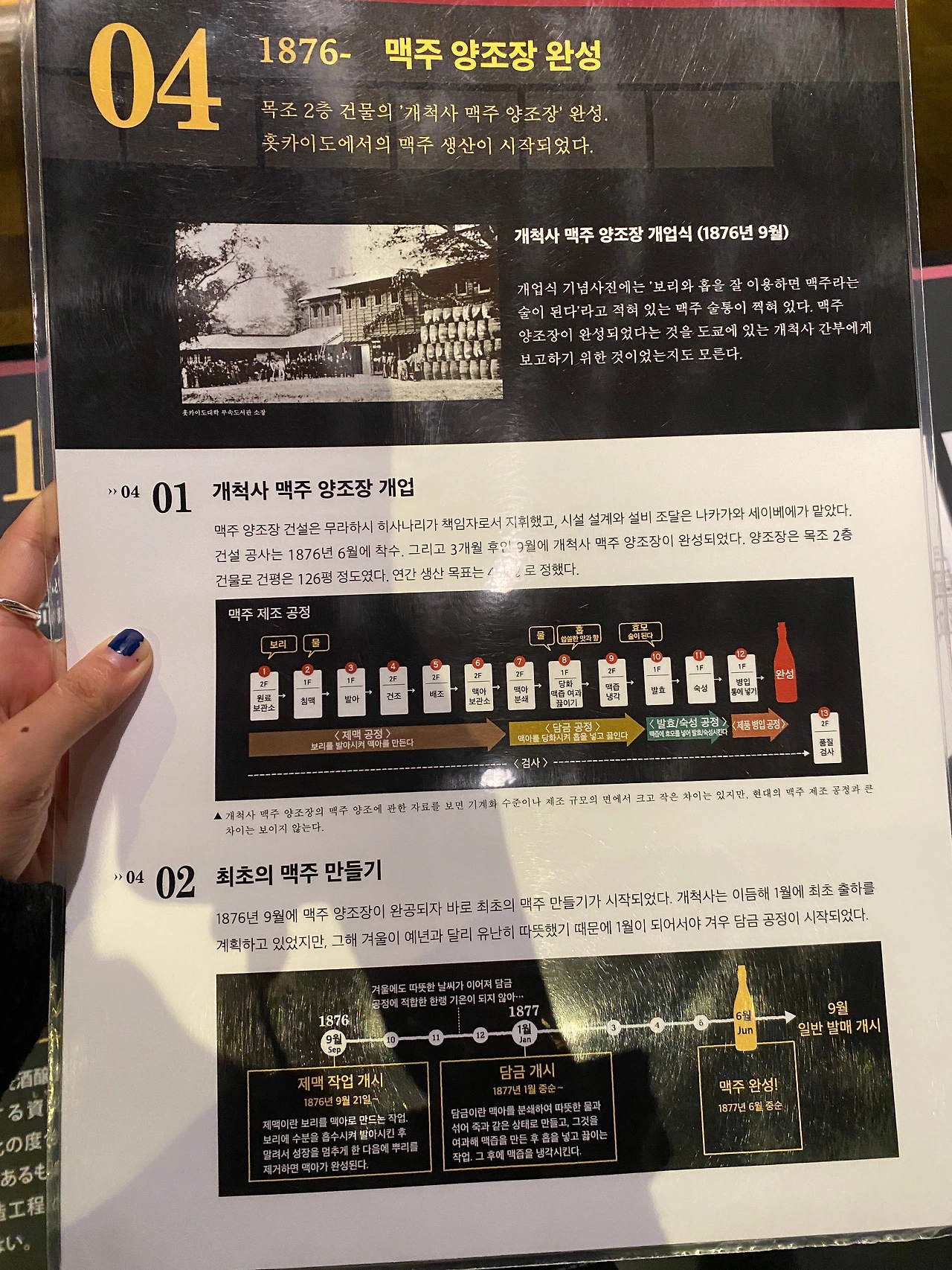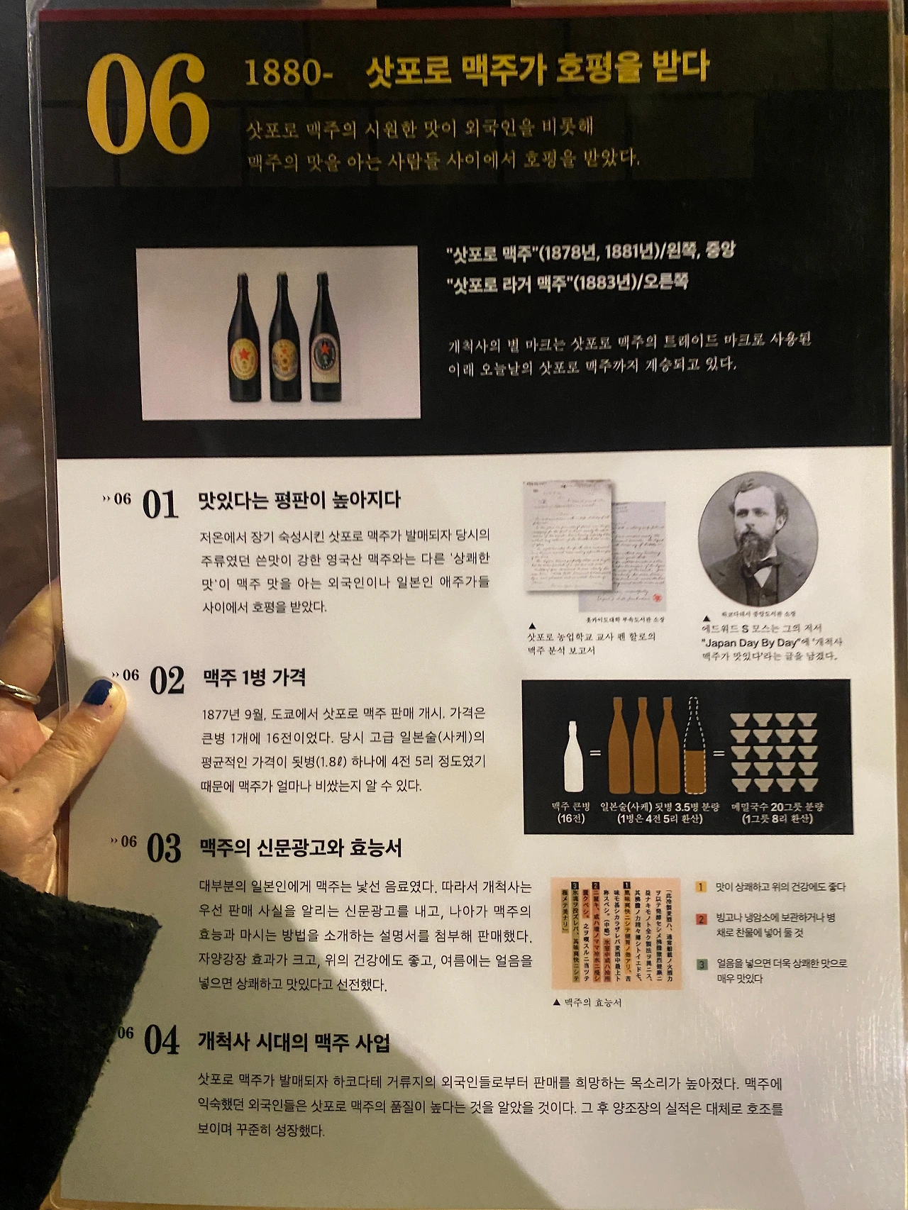 아래는 맥주 시음을 다 한 후 삿포로 맥주의 역사와 설명을 보고 찍은 것이다. 미리 읽어둬도 좋을 내용.