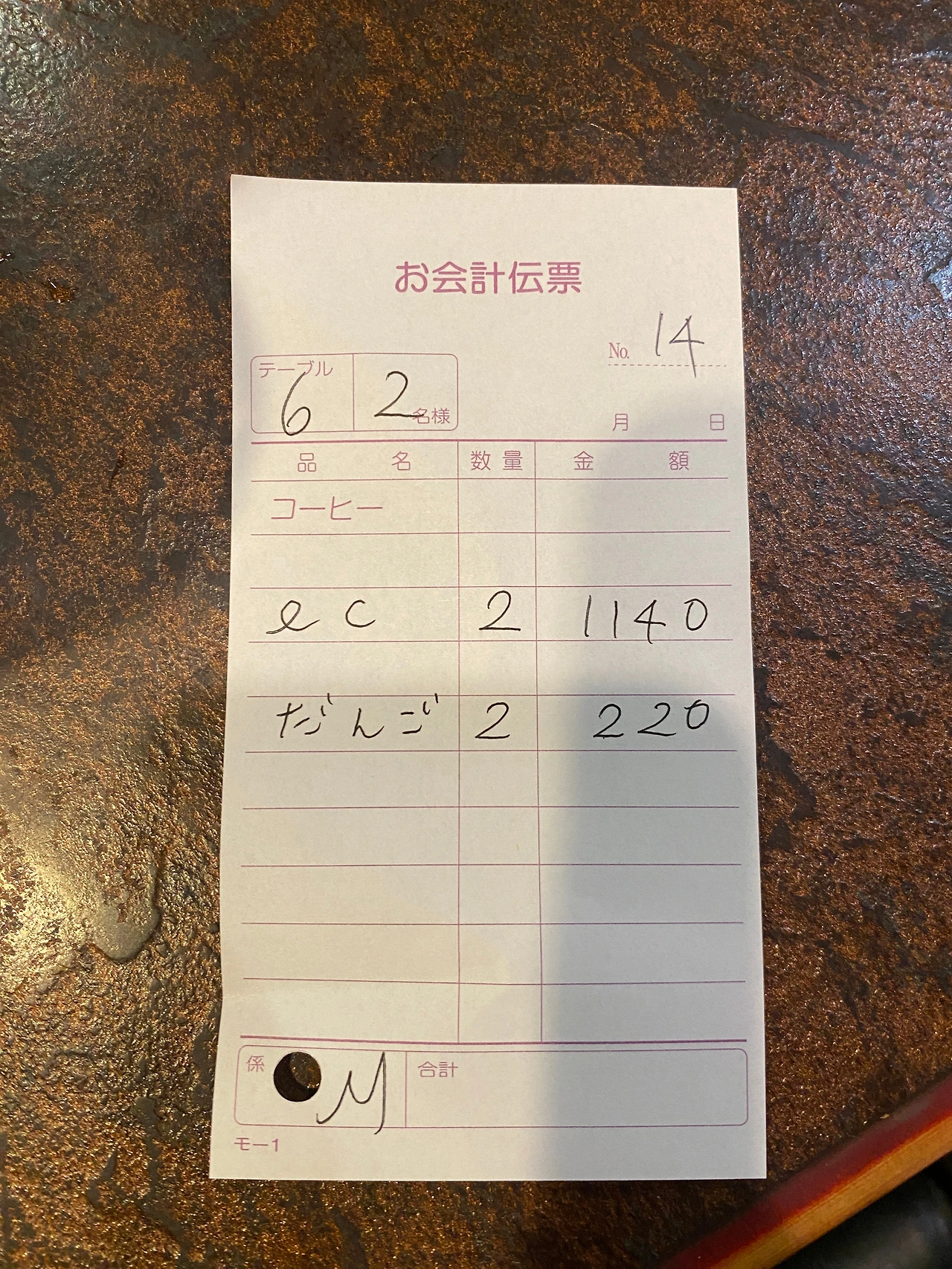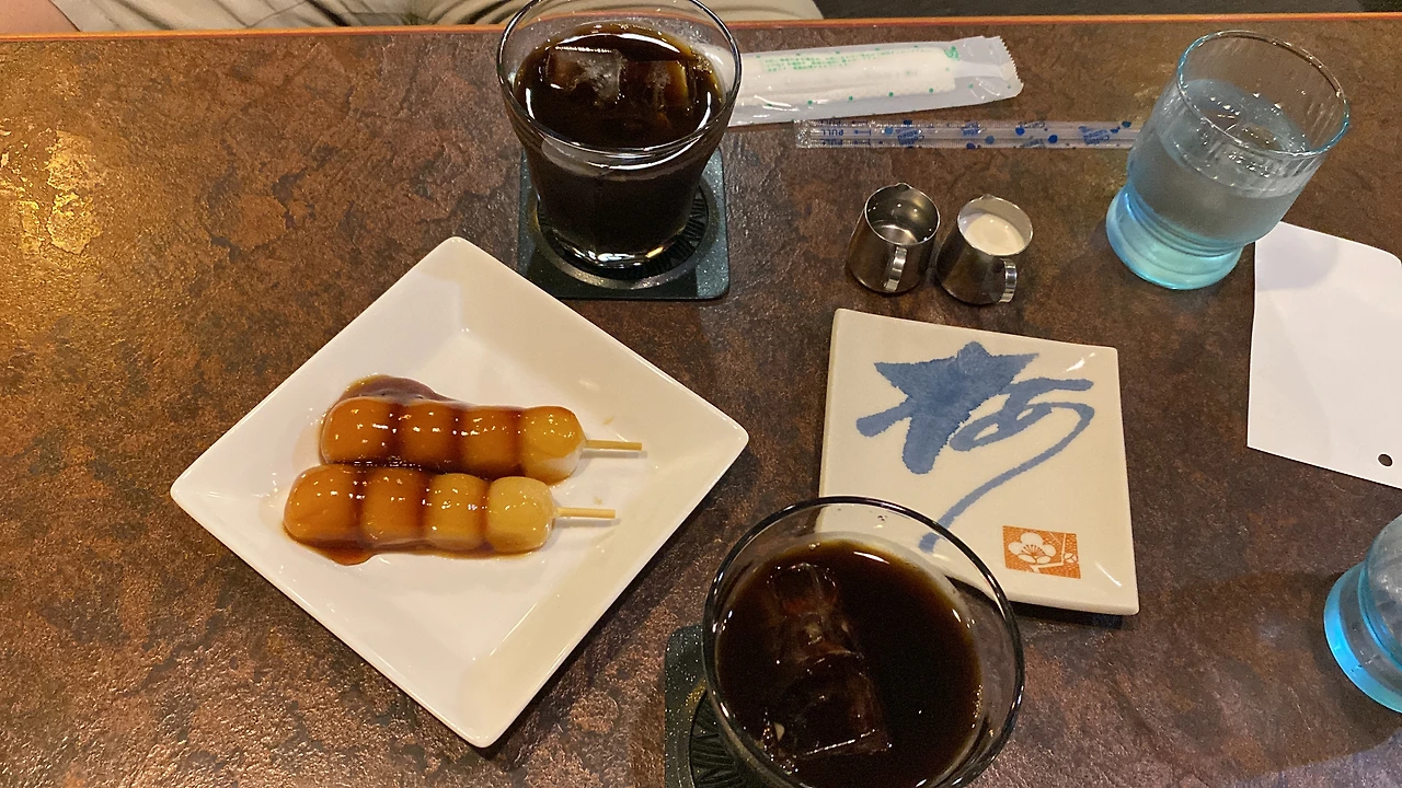 간단하게 아이스커피와 미타라시 당고, 여기서는 正油だんご(쇼오유당고, 간장 당고)를 시켰다. 원래 간장은 醤油로 주로 쓰는데 여기선 正油라고 써서 헷갈렸지만 발음은 같다.
