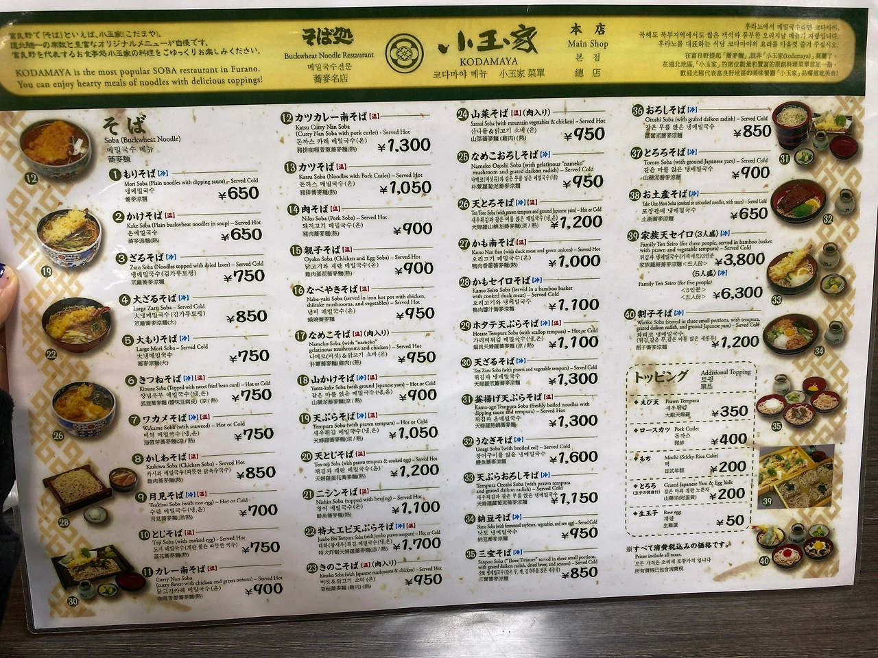 원래 가려고 알아본 소바집 두 군데 실패하고(한 곳은 재료 소진으로 인해 닫음, 한 곳은 휴무) 후라노에서는 꽤 큰 규모인 코다마야 겨우 입장. 대기 줄도 꽤 있었음.