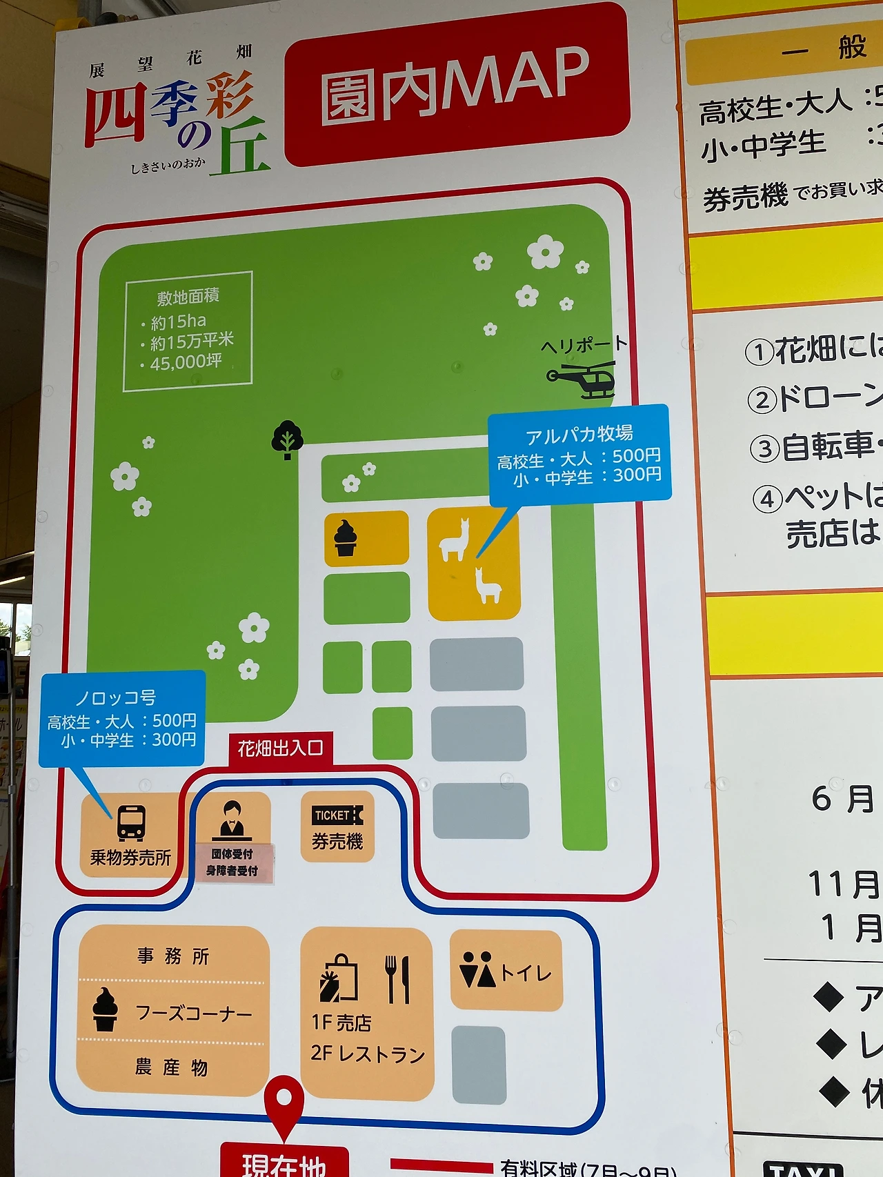 화원 안에는 알파카가 있는 작은 구역과(유료) 드넓게 펼쳐진 꽃밭이 있는데, 이 꽃밭을 트랙터가 이끄는 버스를 타고 한 바퀴 돌 수도 있다.(유료)