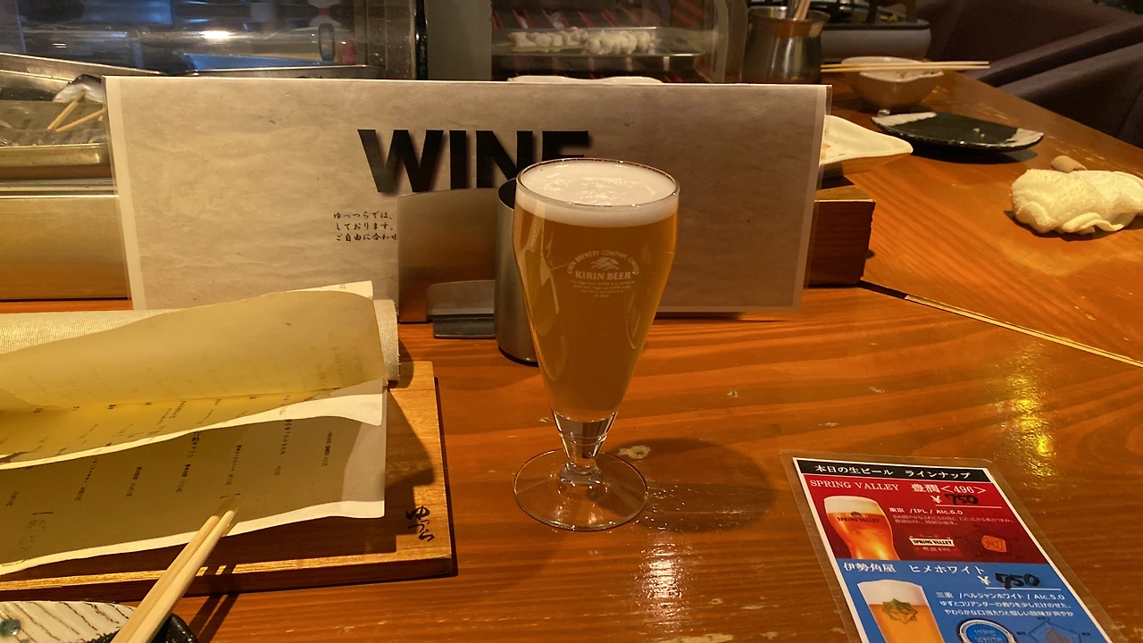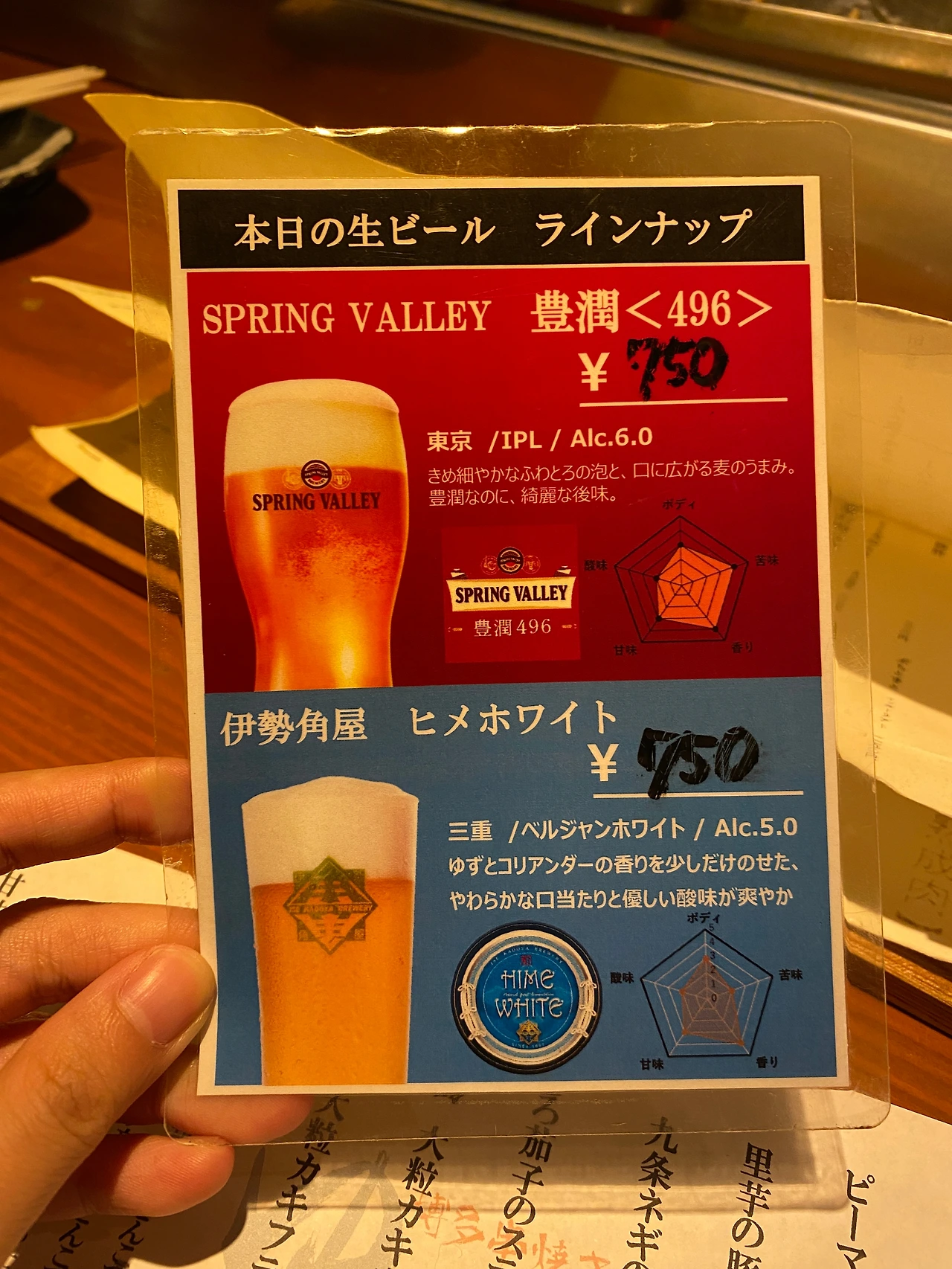 오늘의 생맥주 라인업. 키린 맥주 공장에서 마셔본 spring valley가 있어서 반가웠다.