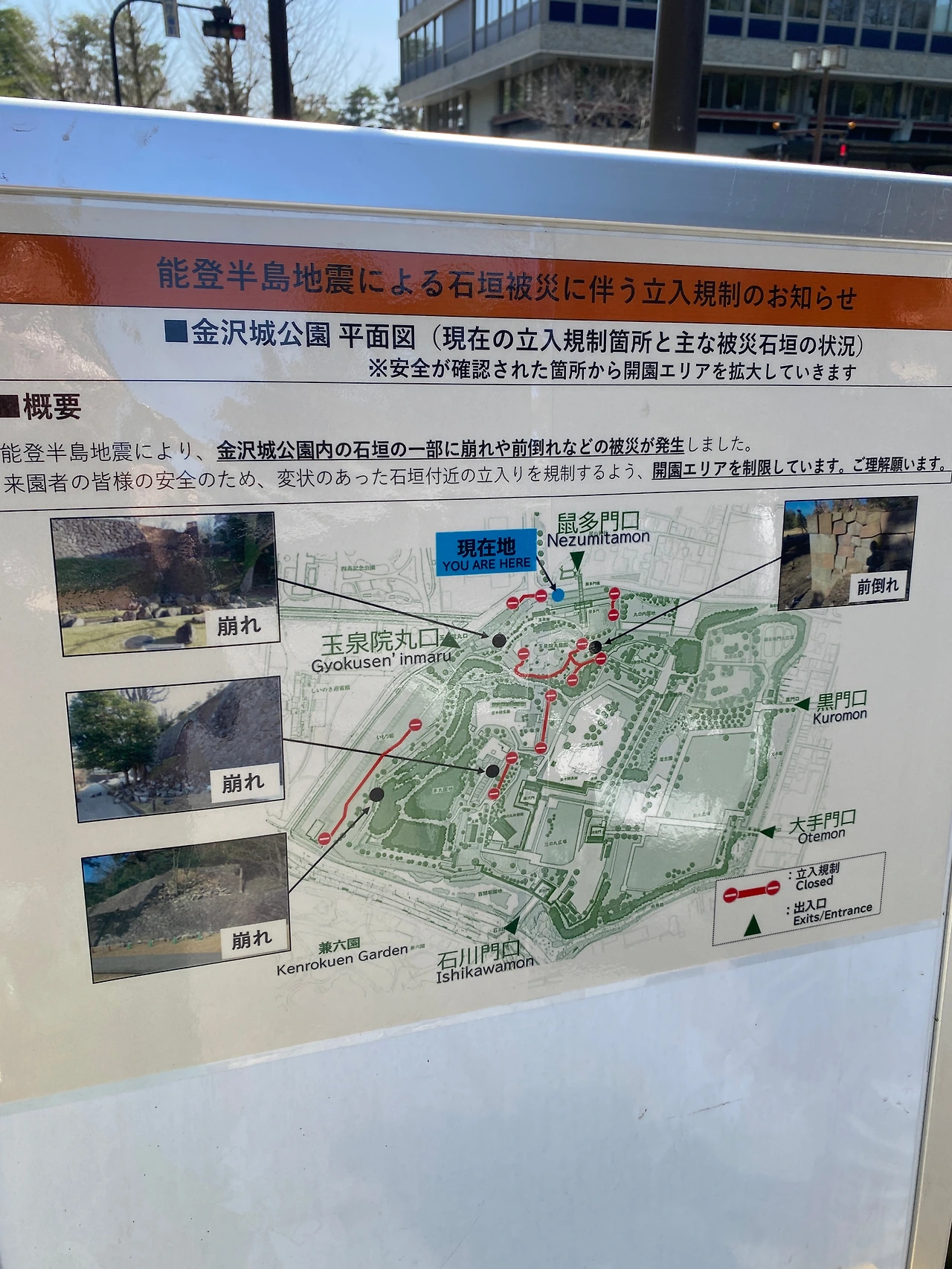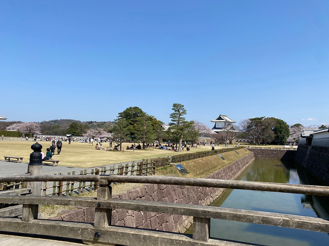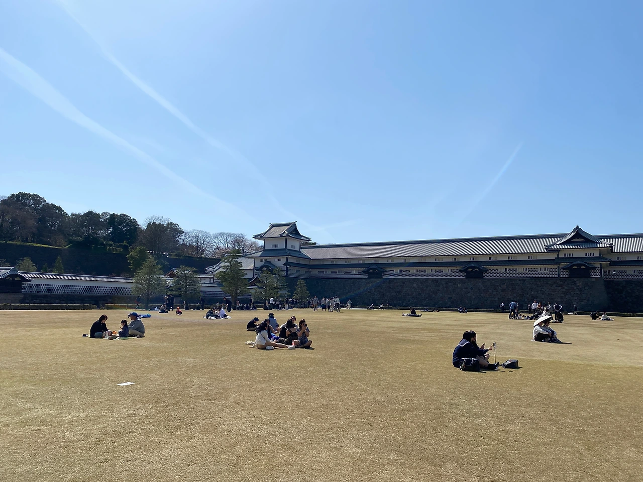 가나자와성은 1592년부터 1620년에 걸쳐 에도 막부 시대 가나자와 번을 통치한 마에다 가문에 의해 건설되었다고 한다. 들어가면 바로 평평하고 넓은 땅이 펼쳐진다.