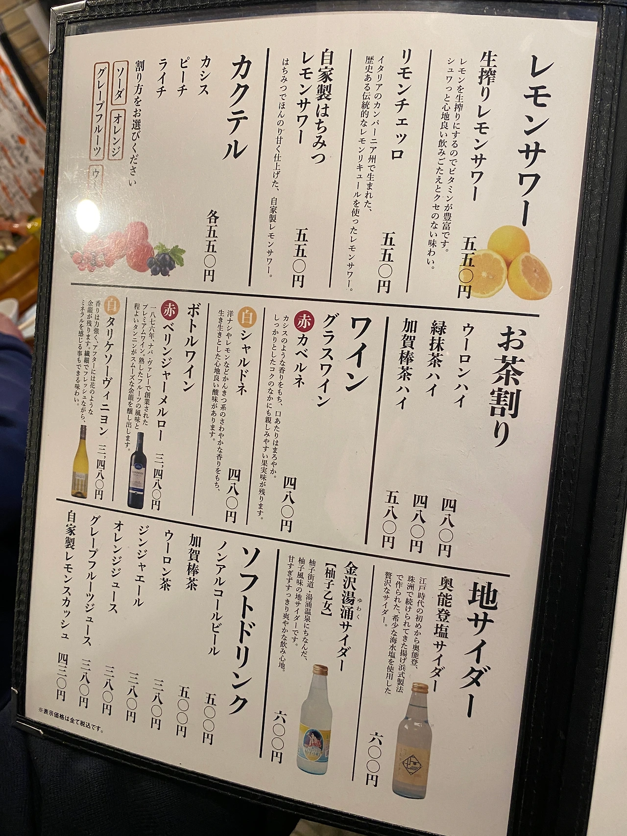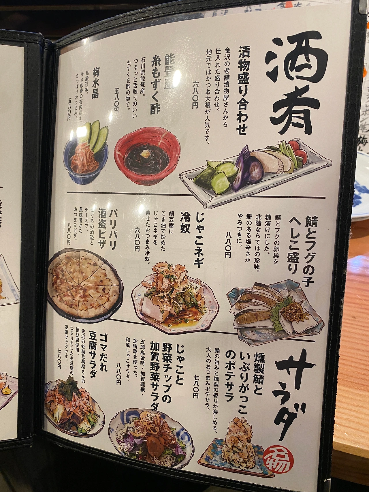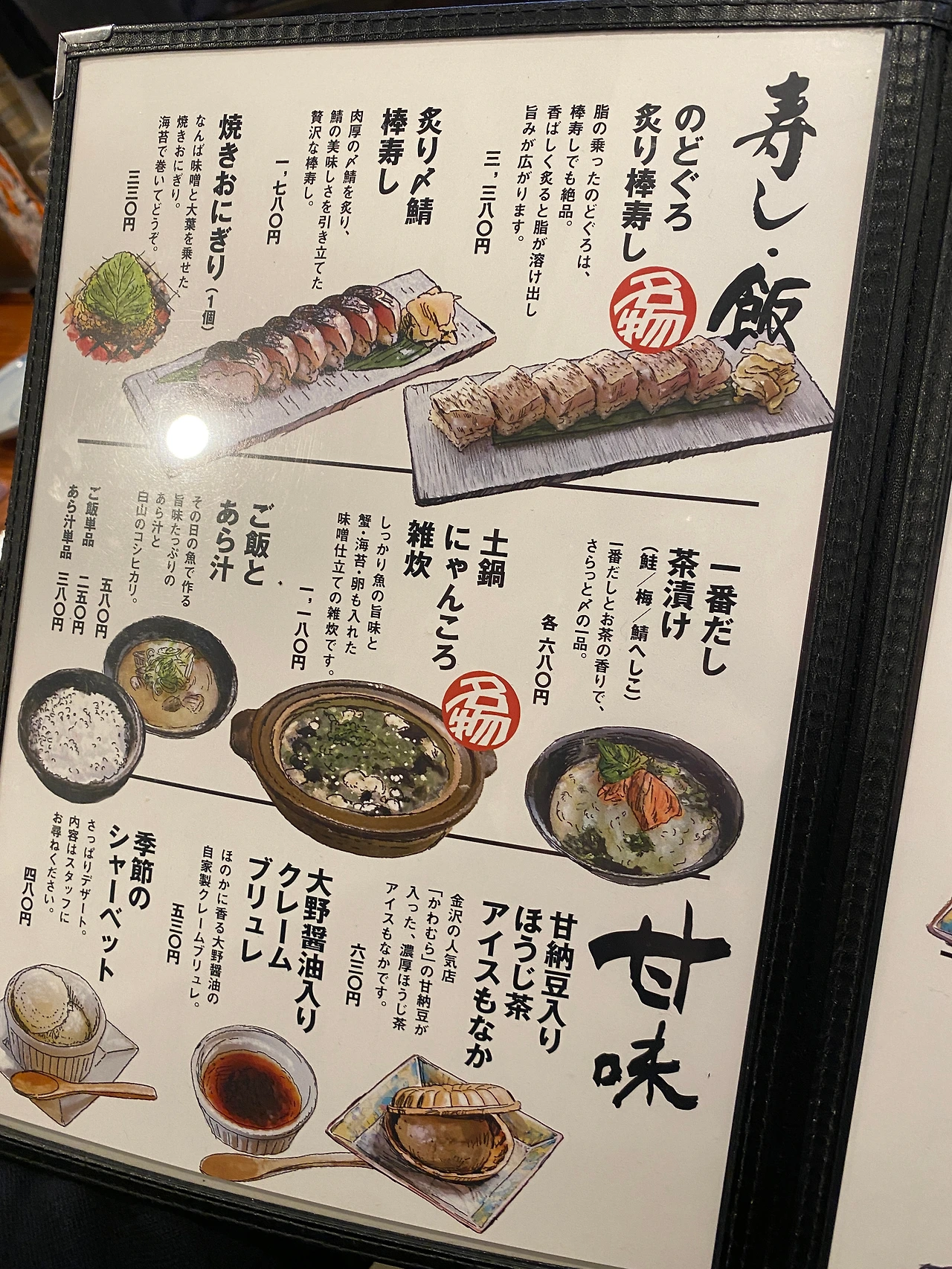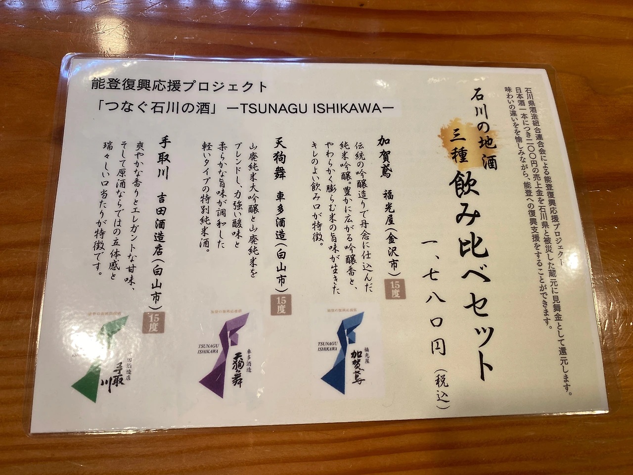 가나자와가 속한 이시카와현의 지역 일본주 3종을 시음하고 비교할 수 있는 세트도 있다. 언제나 노미쿠라베 세트를 보면 가슴이 두근거린다. 이런저런 맛을 설명과 함께 바로 비교하면서 맛볼 수 있어서 내 취향에 대해 발견할 수 있는 기회랄까? 아무래도 이번 생에 술을 멀리하기는 글렀다.