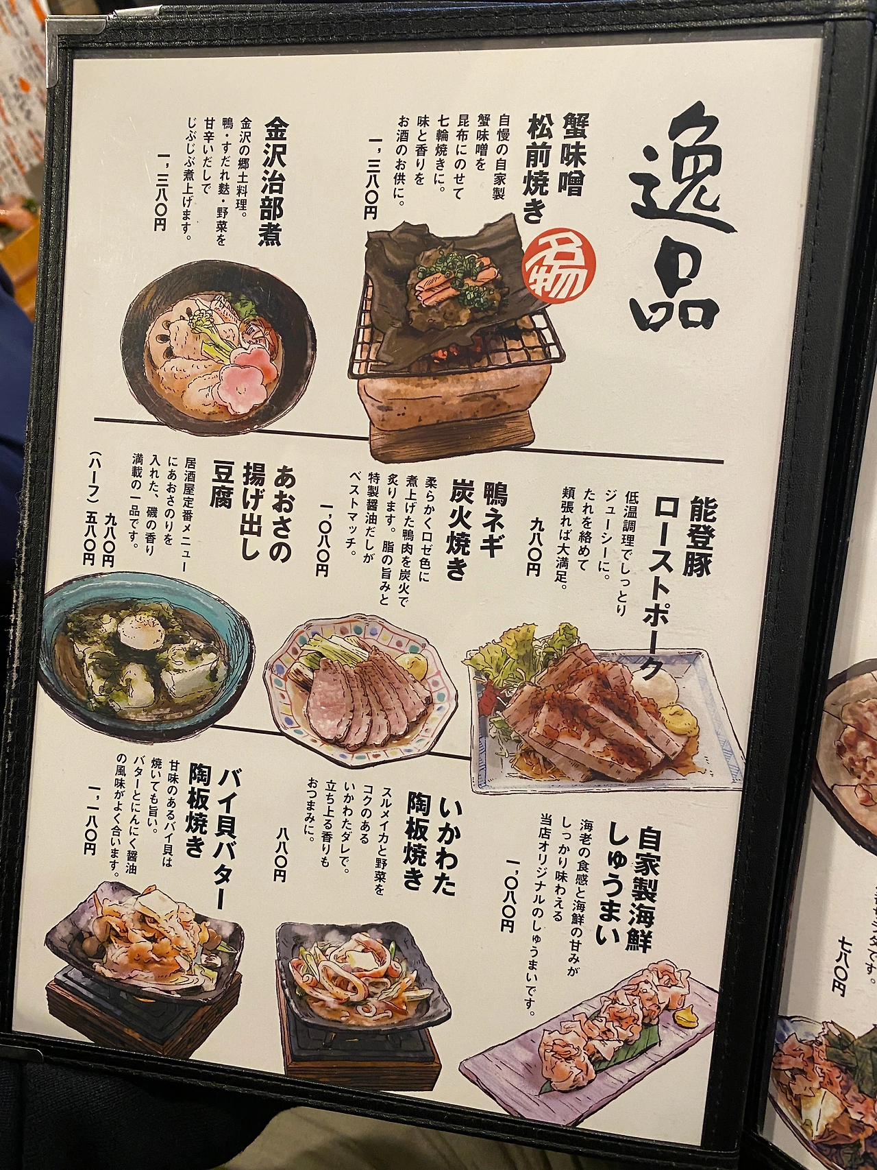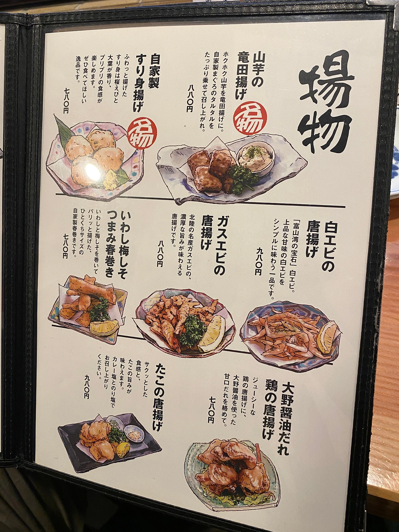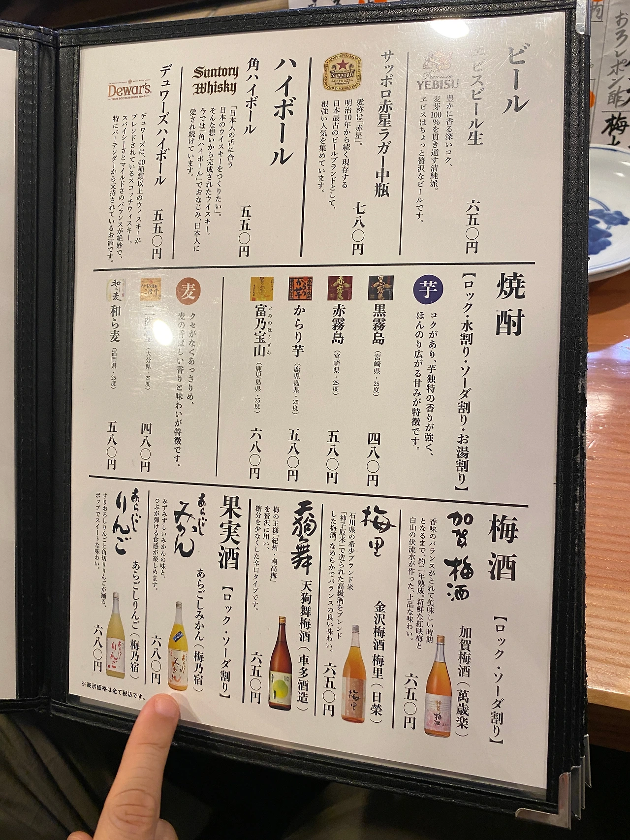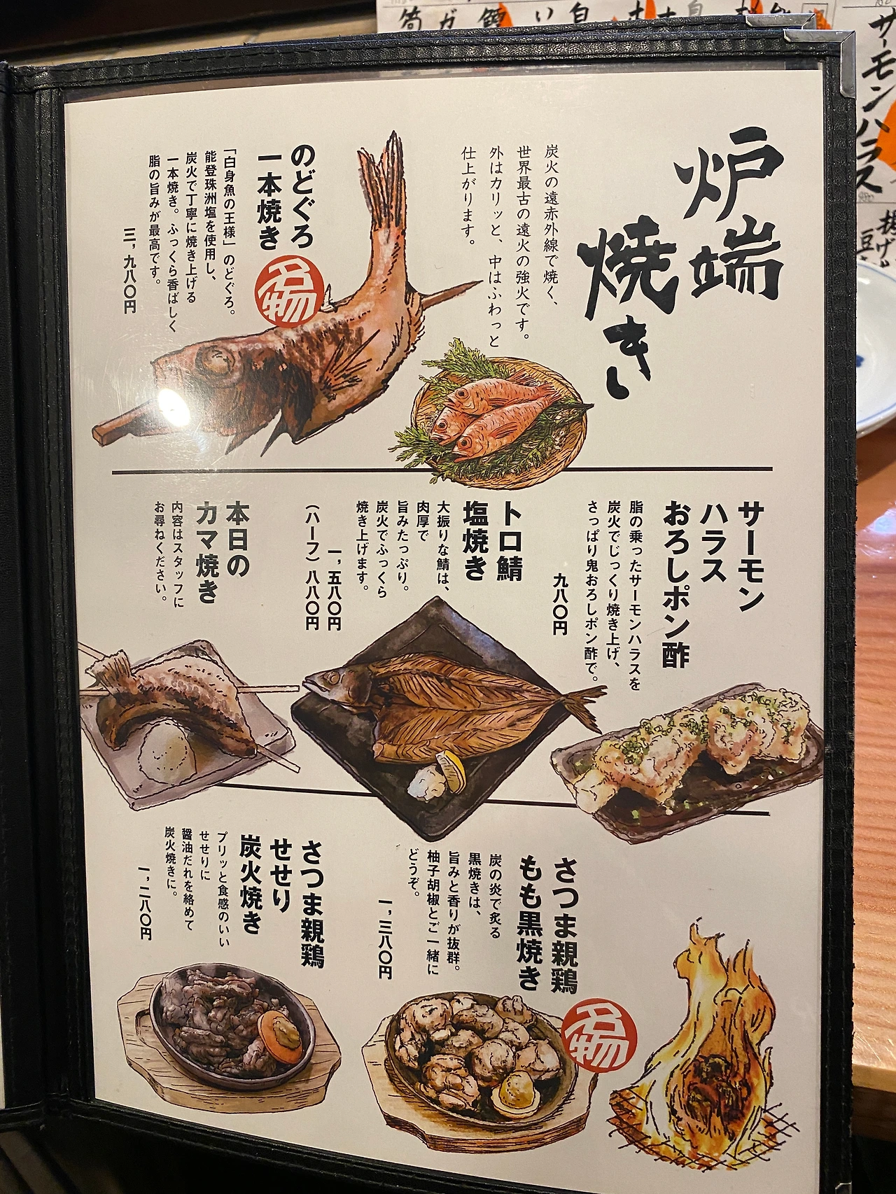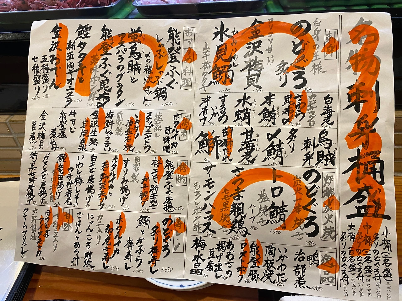 손으로 쓰고 주황색으로 강조한 메뉴 양식은 해산물 이자카야에서 종종 볼 수 있는 양식이다. 신선한 재료를 취급하다 보니 매일 혹은 자주 메뉴를 변경해야 하는 곳에서 쓰는 것 같다.