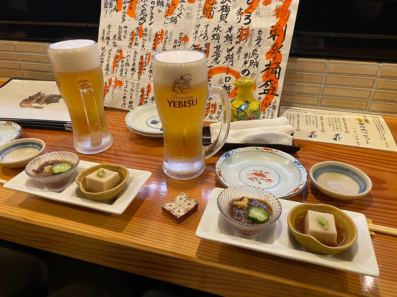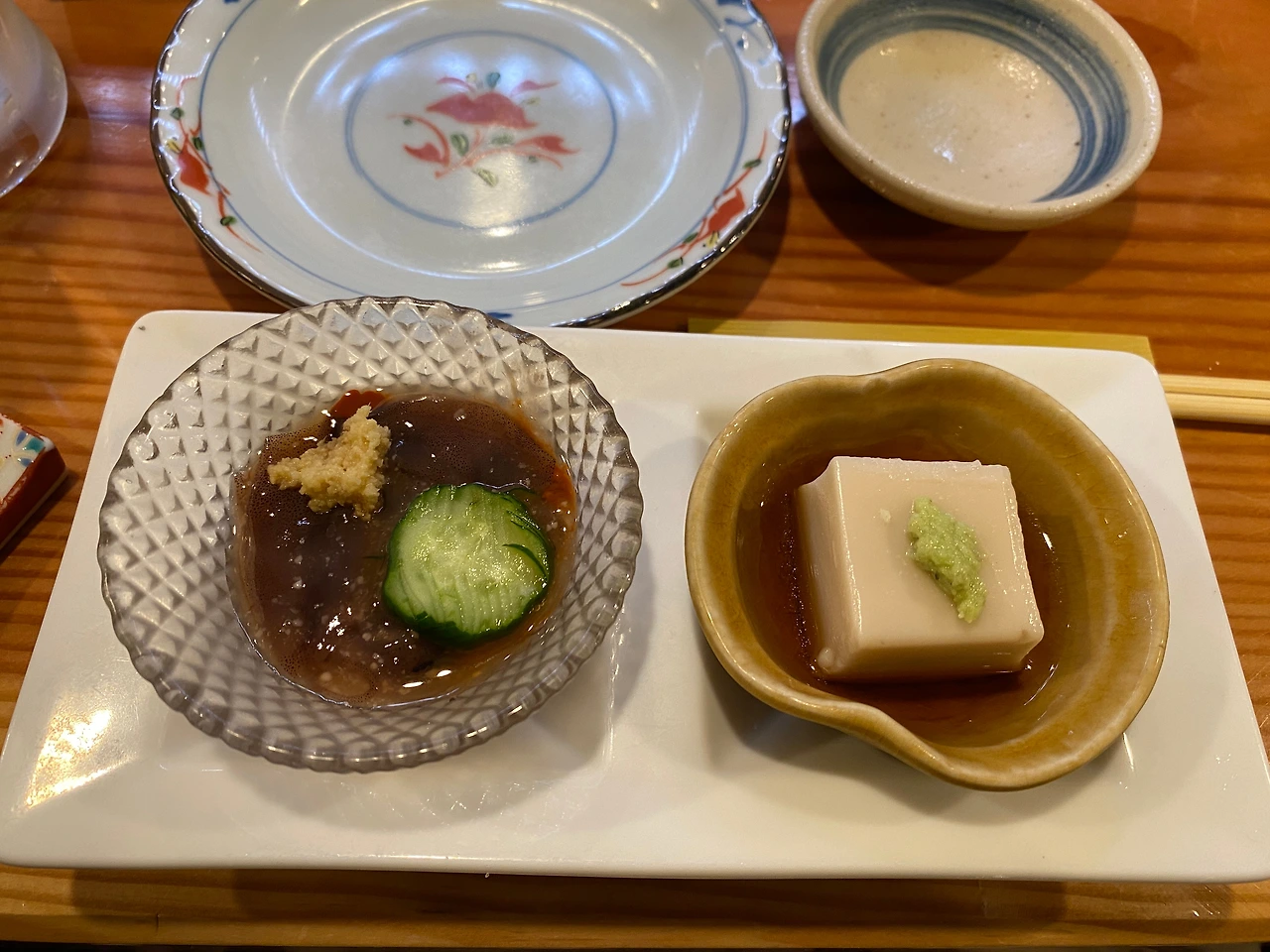 오토시(각 ¥450)로 제공된 두 가지 상큼한 요리. 마침 호타루이까가 제철이라서 초에 절여서 제공되었고, 모찌리 도후 같은 쫄깃 탱탱한 두부 또한 입맛을 돋웠다. 오토시는 집집마다 메뉴도 가격도 제각각인데 요즘 물가가 오르면서 이 정도면 인기 해산물 이자카야에서 적당한 가격과 구성 같다.