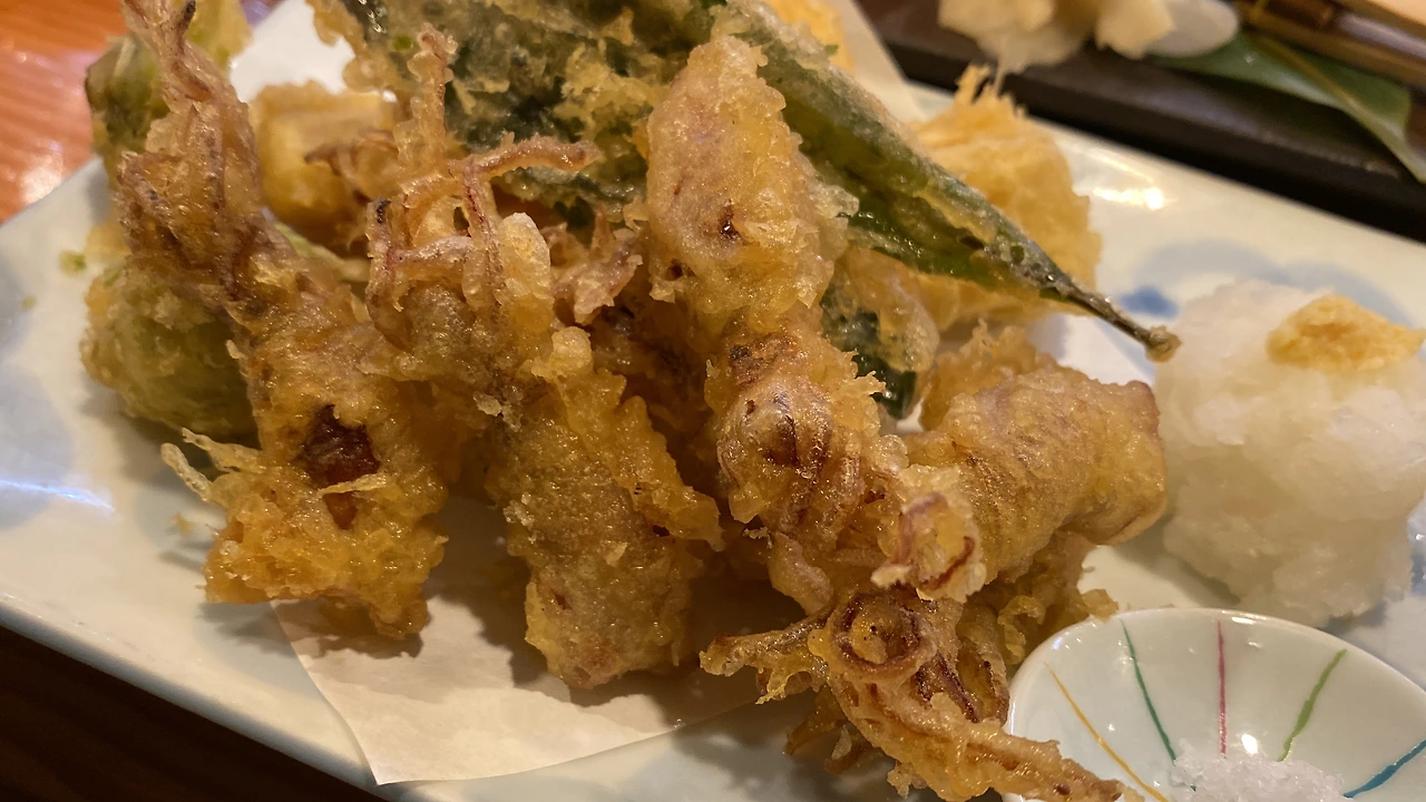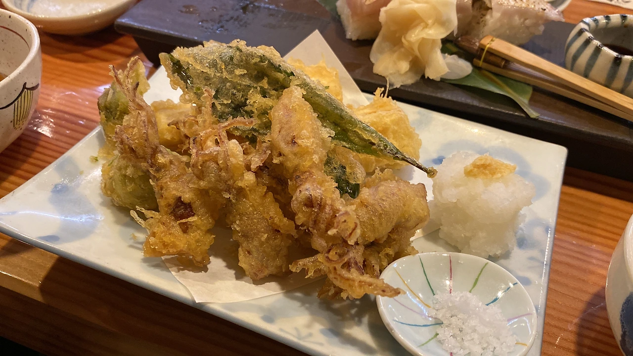 ホタルイカと春野菜の天ぷら. ¥1380. 봄의 신선함을 담은 꼴뚜기외 제철 야채 튀김 요리. 꼴뚜기(호타루이까)가 마침 제철인 것은 오토시를 보고도 느꼈지만 이렇게 튀김으로 먹어도 너무 고소하고 부드럽고 신선한 것이 느껴졌다.