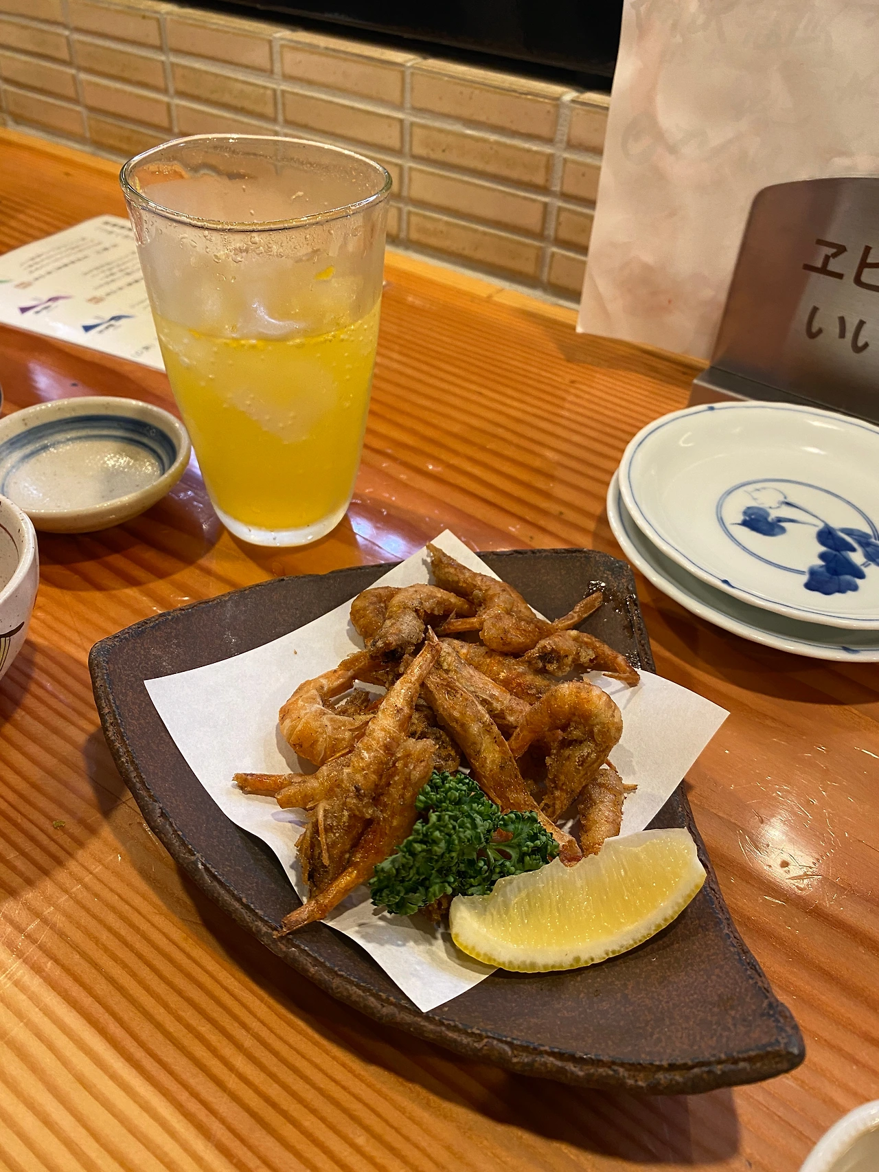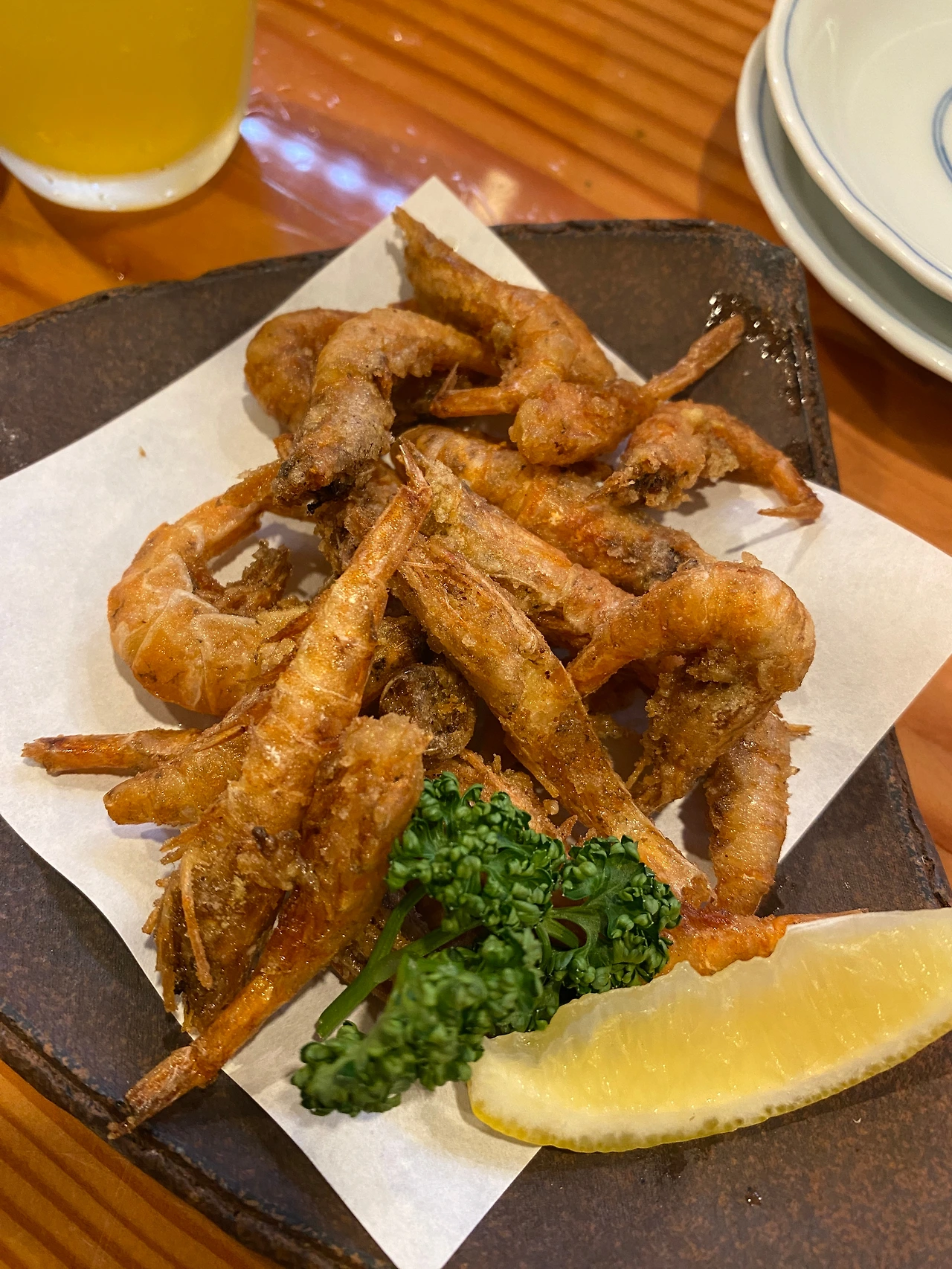 ガスエビの唐揚げ(가스에비노 가라아게, 가스에비 튀김) ¥880. 고소하고 농밀한 맛의 가스에비는 이 근방에서 봄에 제철이다. 가스새우는 껍질이 얇고 부드러워서 가라아게로 튀기면 통째로 먹기에 좋다.