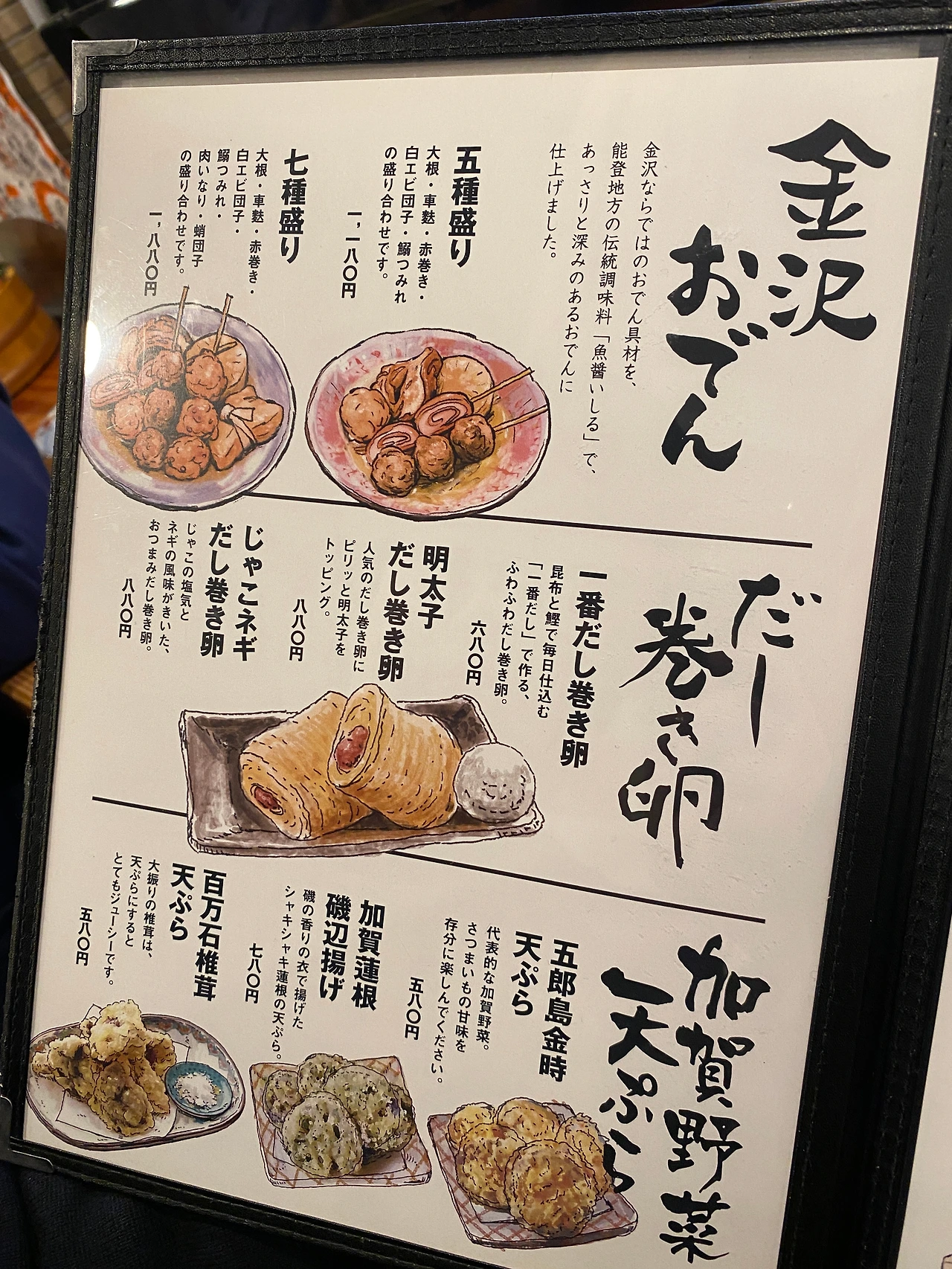 おでん5種. 오뎅 5종. ¥1,180. 가나자와가 워낙 오뎅으로도 유명한 것으로 알려져 있기에 시켜보았다.