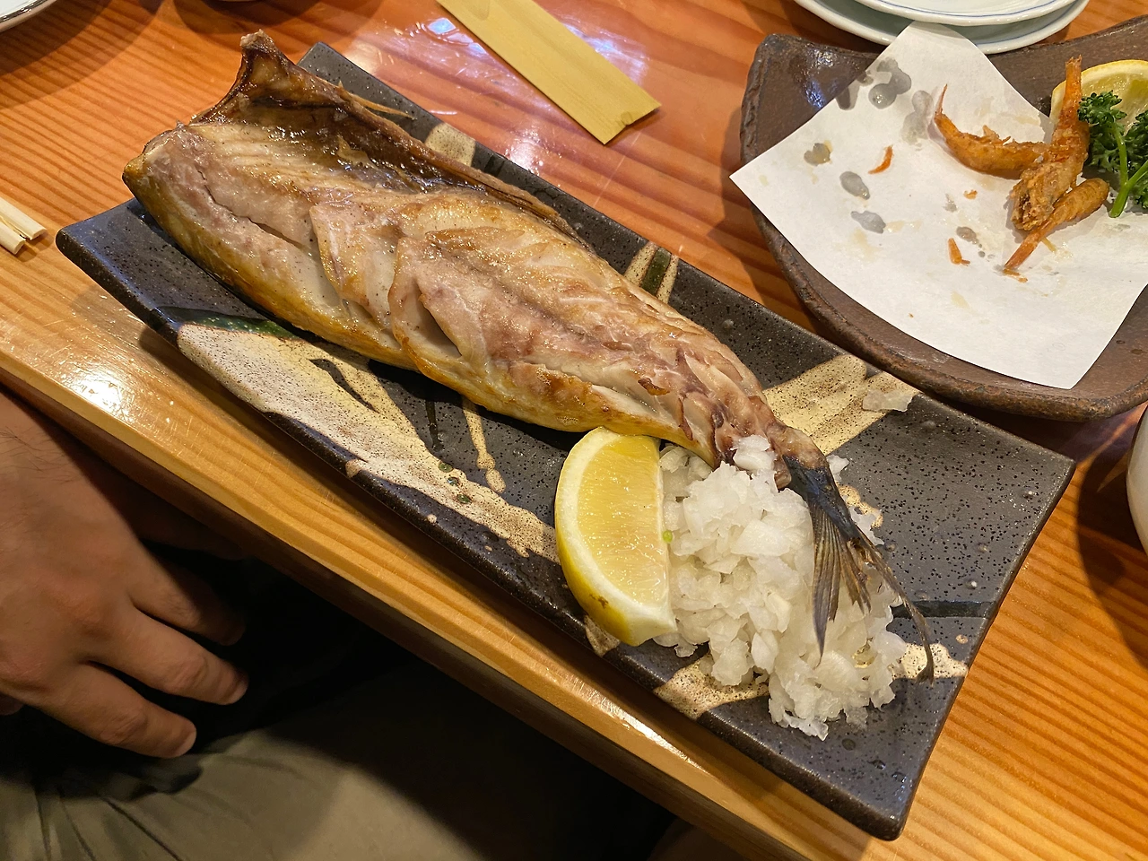 トロ鯖塩焼き ハーフ. ¥880. 토로사바 소금구이를 하프(half 절반)만 시켰다. 토로사바는 고등어 중 지질 함량이 21% 이상인 것을 가리킨다고 한다.