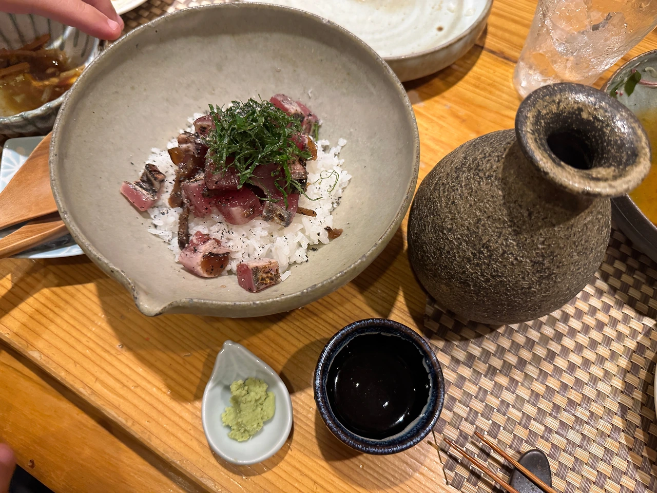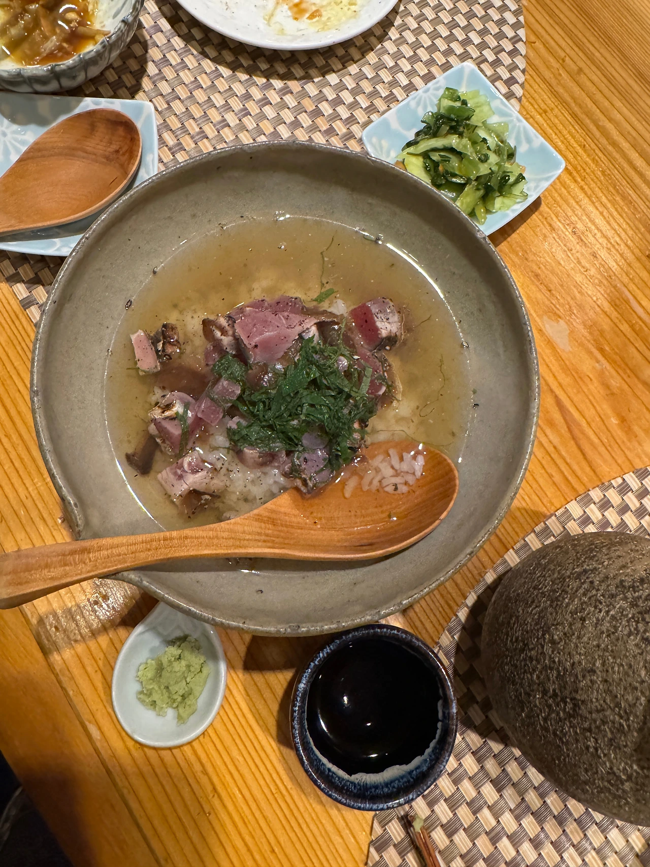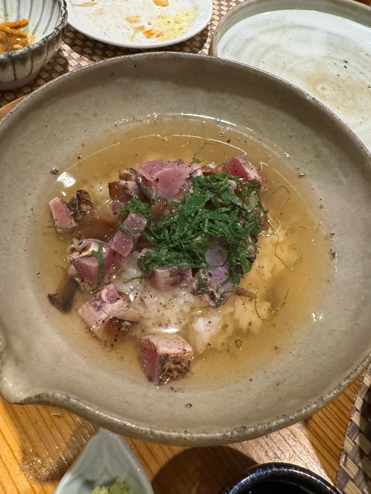 カツオお茶漬け(가츠오오차즈케). 오차즈케를 먹고 싶은데 위에 생선을 올려주면 좋겠어서 오마카세로 맡겼더니 가다랑어인 가츠오를 듬뿍 올린 오차즈케가 나왔다.