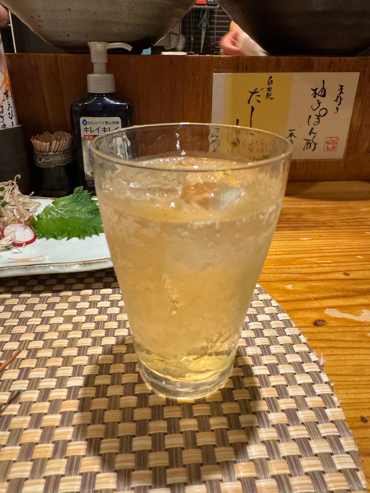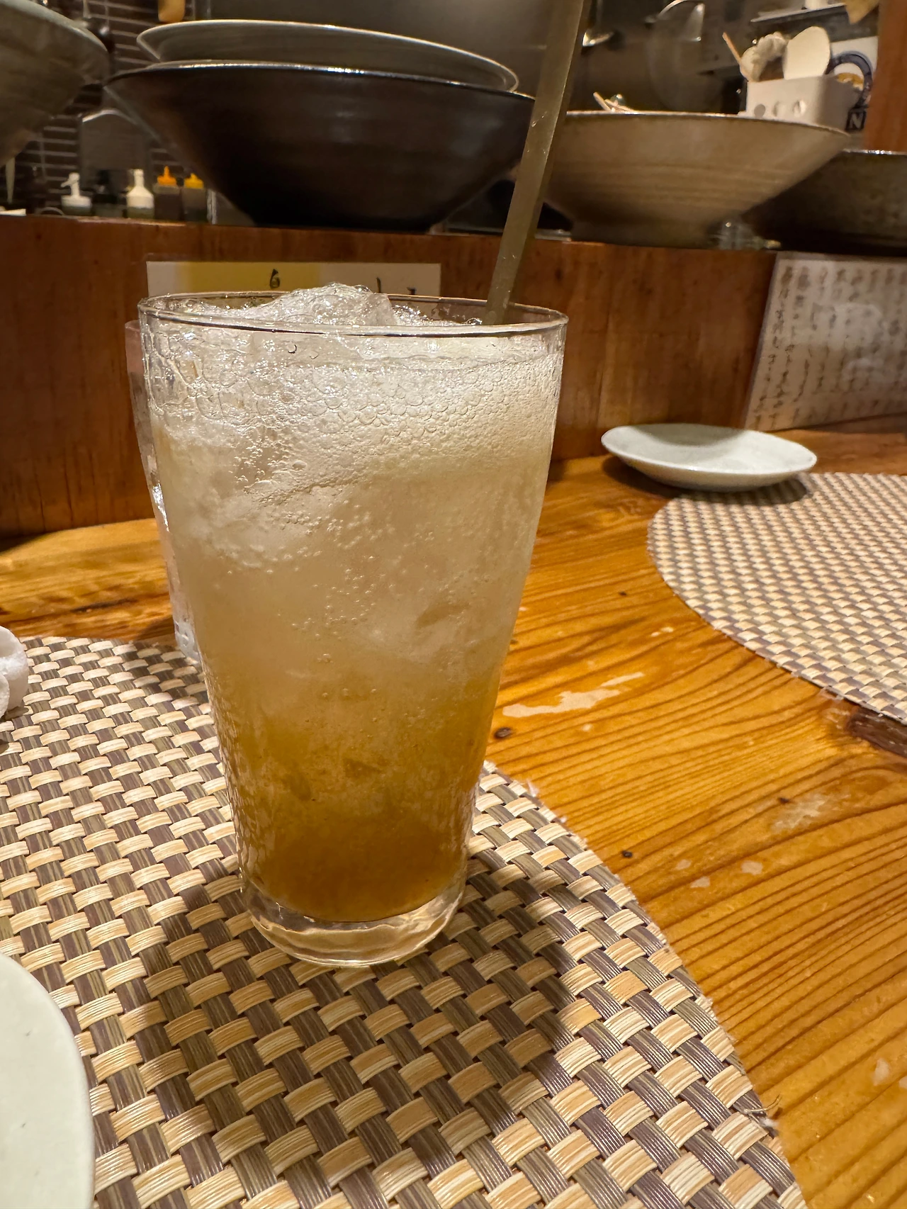 梅酒のソーダ割り(우메슈노소다와리). 배부를 때도 술술 들어가는 매실주+탄산소다의 조합. 이상하게 여기서 마시면 매실주와 탄산소다를 섞은 비율이 좋은지 진하면서도 단 맛이 완성된다.