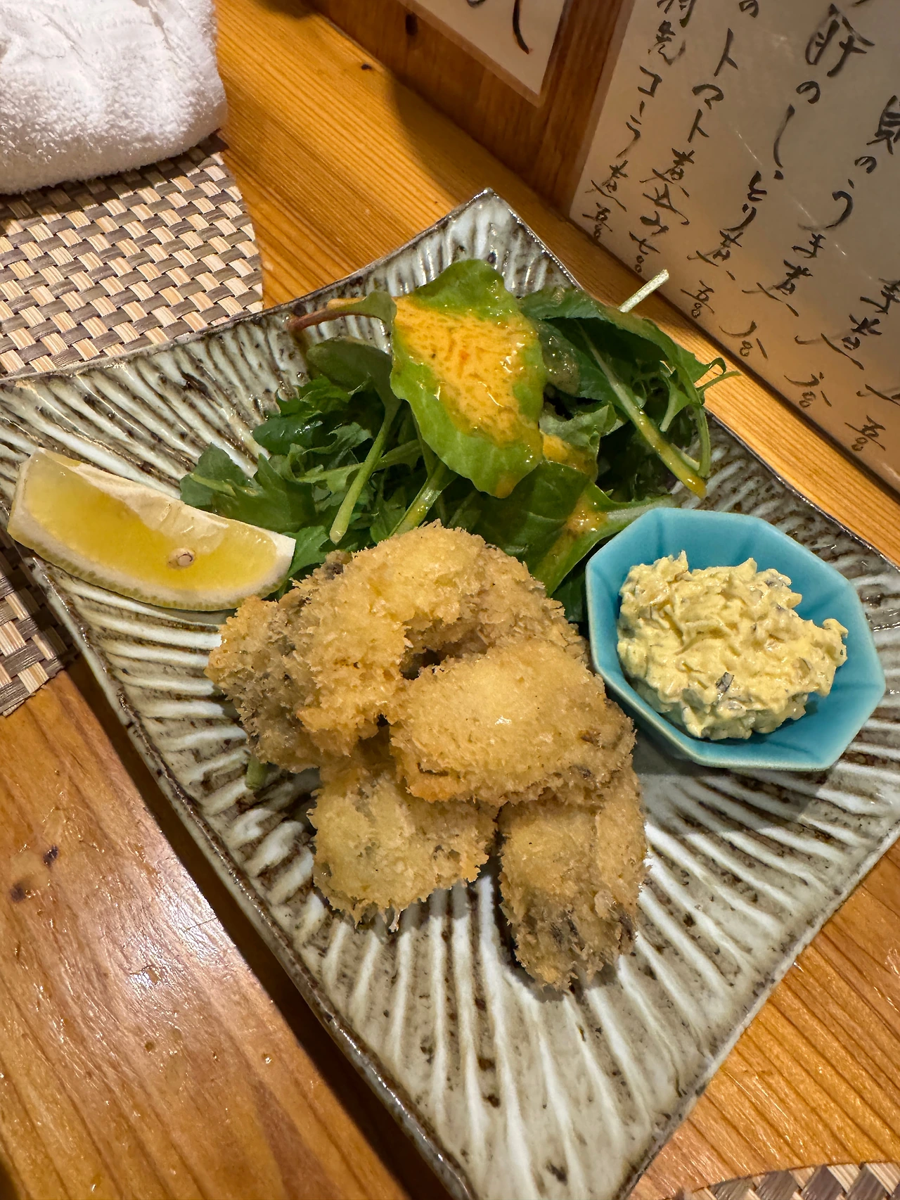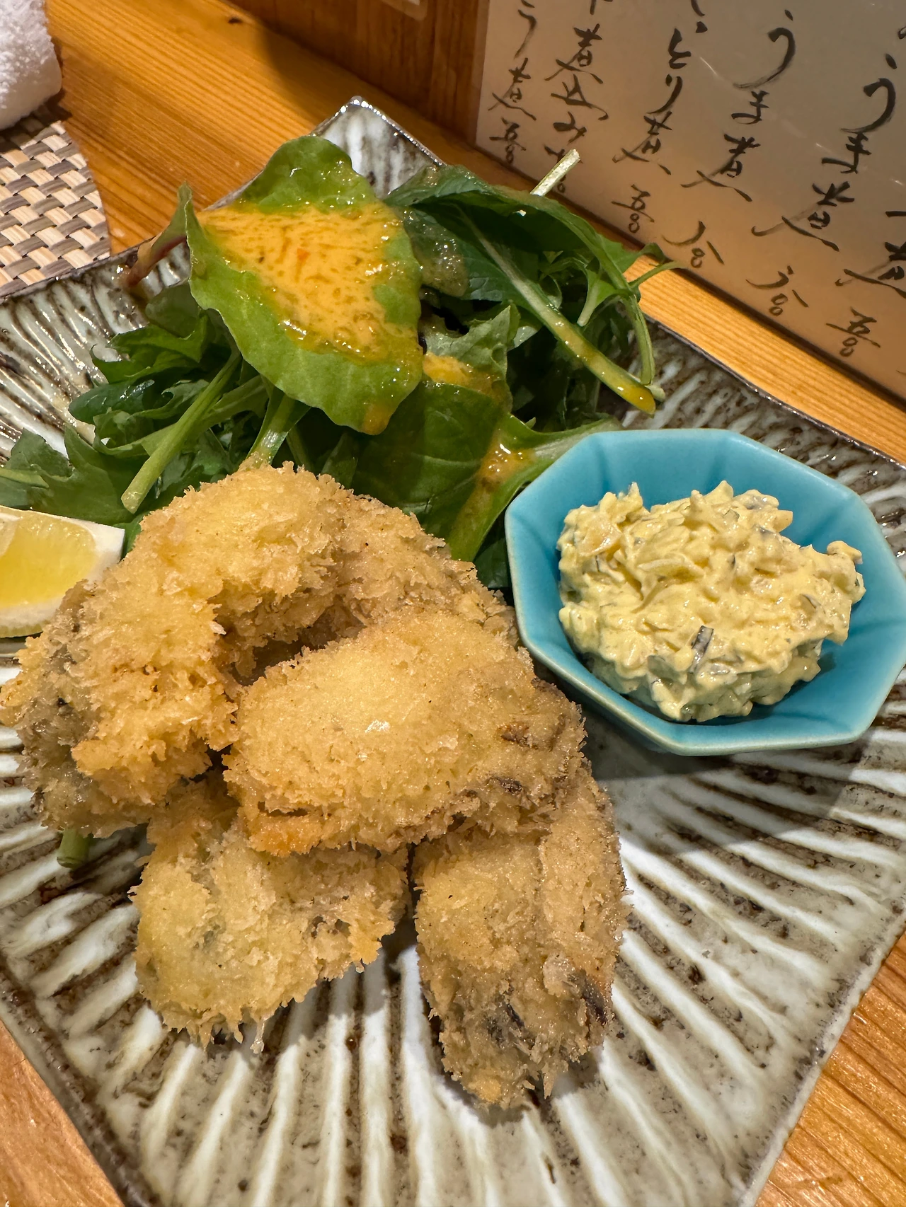 牡蠣フライ(카키후라이 1000¥). 역시 오카모토에서는 튀김도 예술로 튀겨준다. 후라이는 텐푸라랑은 또 겹치지 않는 맛과 식감이라서 직접 만든 타르타르 소스(개꿀맛)와 함께 잘 먹어치웠다.