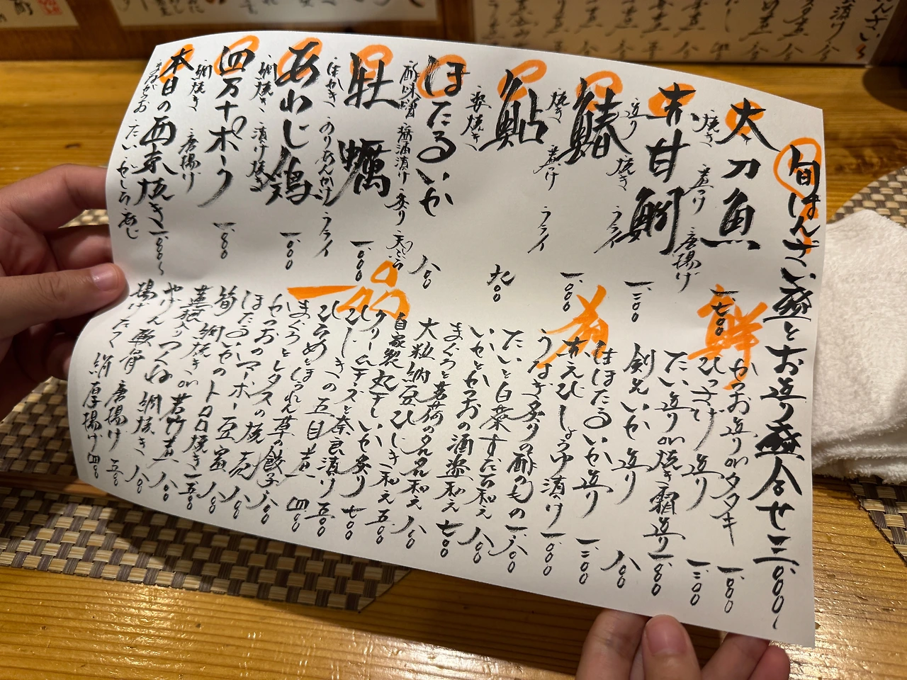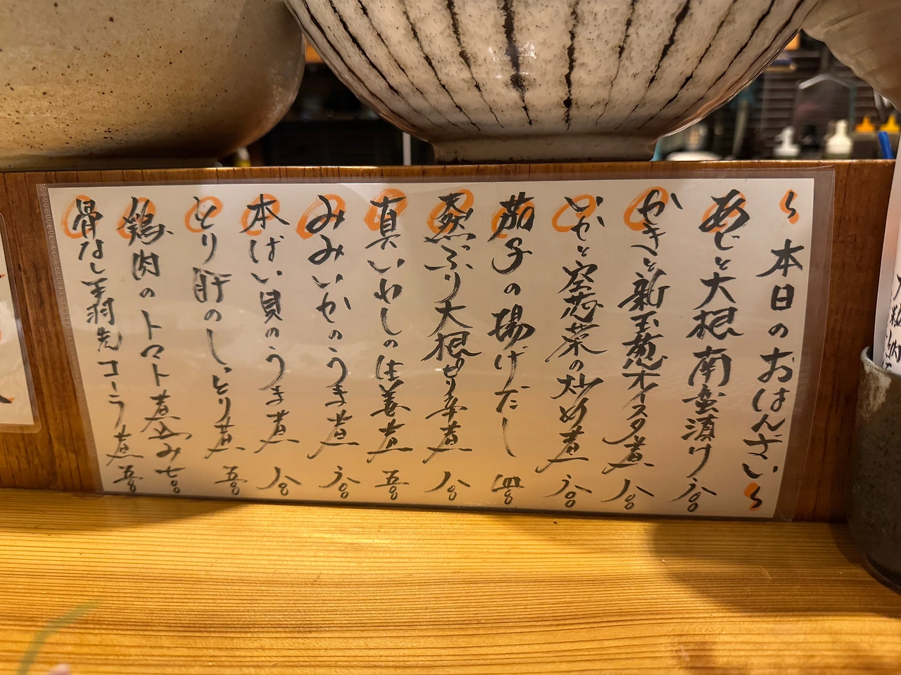매일 바뀌는 메뉴. 일본에서 이런 손글씨 메뉴에 주황색 하이라이터를 보면 일단 마음이 놓인다. 신선한 재료를 사용하는 맛집의 상징!