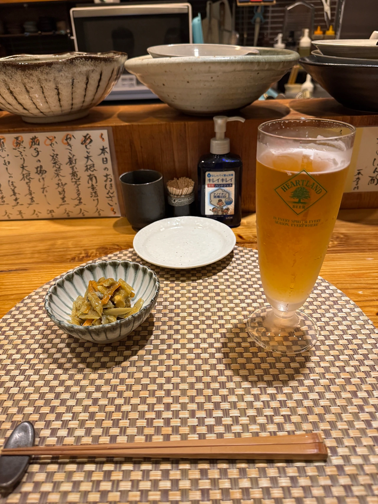 옆에 앉은 단골 아저씨가 1L짜리 피처로 하트랜드를 마시고 있어서 스몰톡을 나누기도 했다. 일본에서는 술고래를 ザル(자루)라고 한다는데 자루소바를 내놓는 소쿠리, 채처럼 술에 안 취하고 통과시키는 느낌이어서 그렇다고 한다.