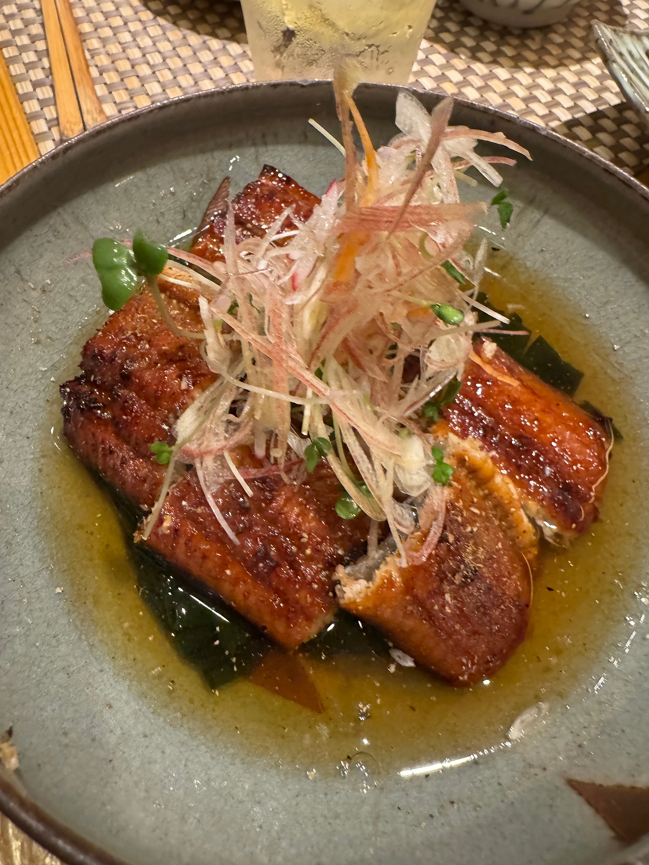 うなぎ炙りの酢の物 (우나기아부리노스노모노 1800¥). 이것도 어디서도 이만큼 만족할 만한 대체제를 찾지 못한 오카모토 시그니처 메뉴. 소스에 부드럽게 잘 익힌 장어를 산뜻시원한 식초 베이스 국물에 담궈서 미역, 위에 곁들인 아삭한 양파채와 함께 먹으면 장어의 기름진 맛과 산뜻한 그외 모든 것이 너무 잘 어우러져서 아무리 배가 불러도 먹을 수 있는 맛. 고급스러운 조합이다.