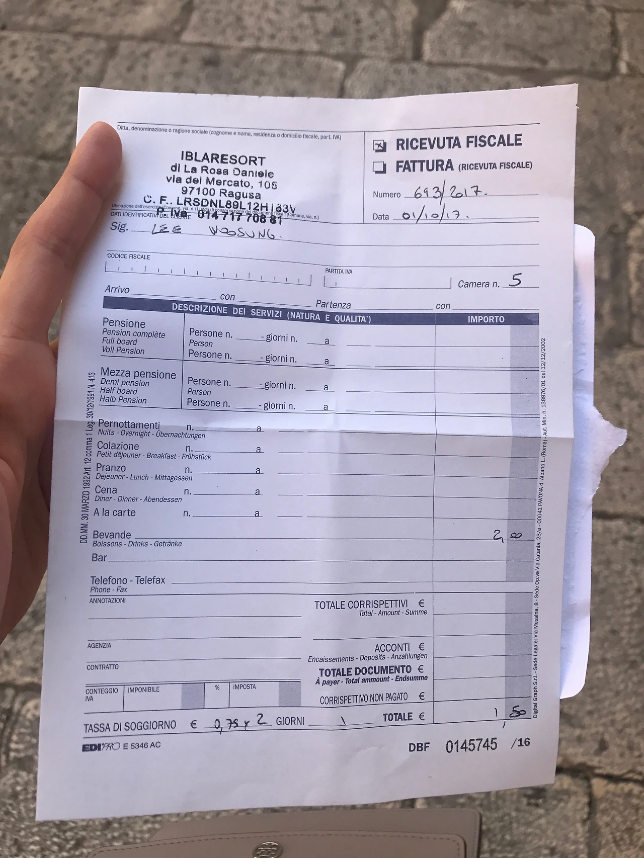 TMI. 라구사 슈페리오레를 둘러본 우리는 호텔로 돌아가 체크아웃을 하고 1.5유로의 라구사 tassa di soggiorno 시티택스(체류 세금)를 냈다. 인당 75센트였다. 이탈리아의 도시들에 숙박하게 되면 각 도시의 시티택스를 내야 하는데 약간씩 차이가 있다.