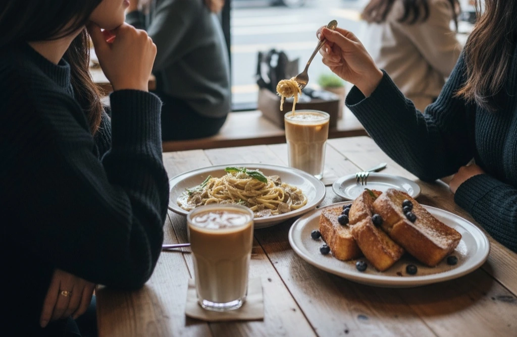 트러플 향이 가득한 화이트라구 파스타와 블루베리 프렌치토스트, 그리고 고소한 우유맛이 진하게 느껴지는 라테 두 잔을 앞에 두고 이어간 정오의 브런치.