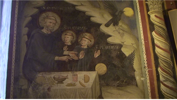 두 번째 방은 베네딕토 성인의 생애를 그린 벽화들로 가득했다. 1400년대에 그려진 것들로 이탈리아 움브리아 파의 그림이라고 한다. 시에나 파의 밝고 화려한 색채와 달리 노란색과 갈색을 위주로 한 벽화는 어둡고 무거운 느낌을 주었다. 중세의 그림들은 화려함을 지향해서 원색을 많이 썼으며, 노랑과 갈색은 불쾌하게 여겨 그다지 좋은 의미를 부여하지 않았다고 한다. 성인에 대한 독살 음모를 그린 두 그림의 어두운 노란색과 갈색은 정말 무겁고 답답하게 느껴진다.