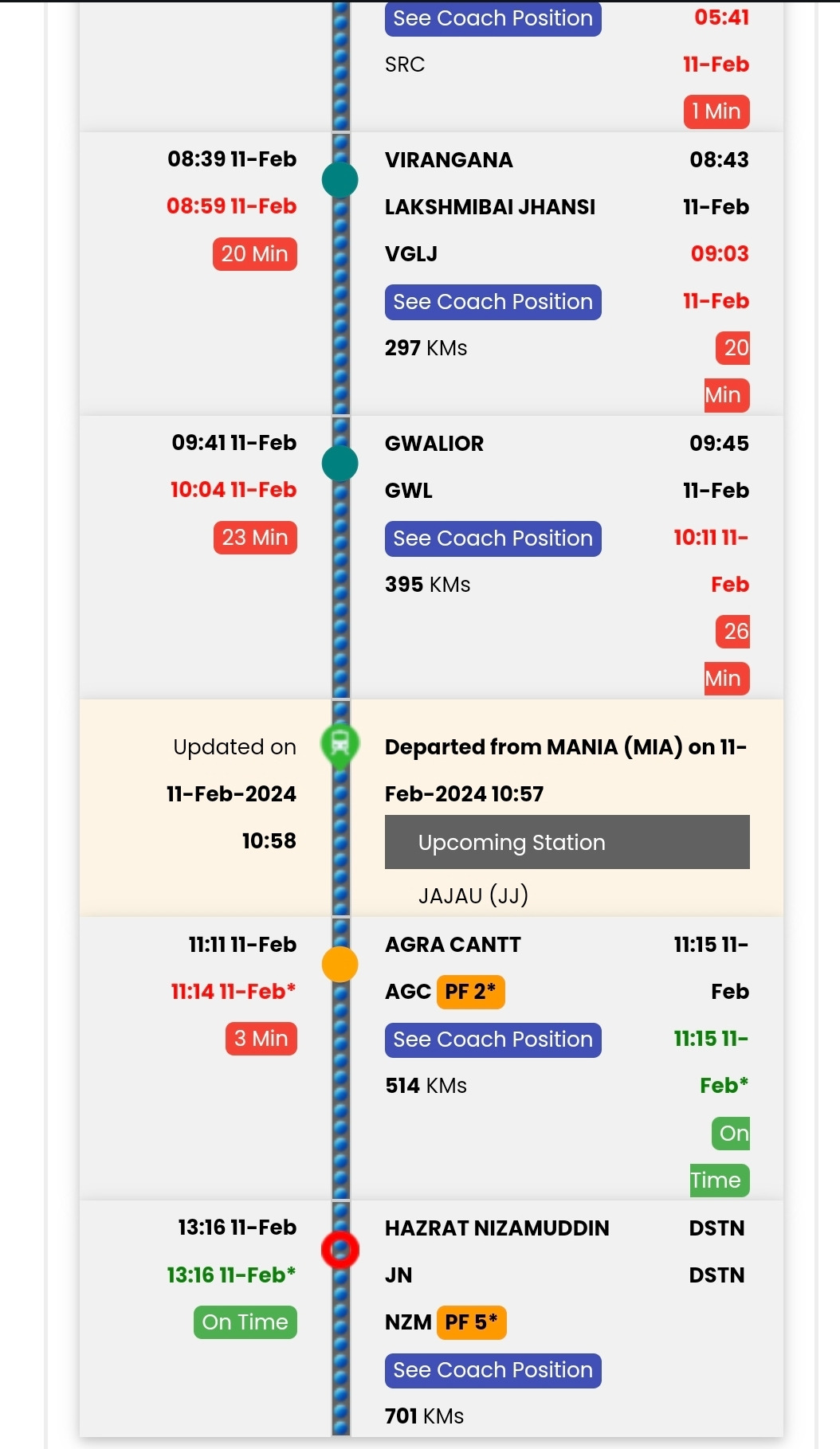 인도의 기차를 탈 때 on time은 흔한 일은 아니다. 그래도 나는 류시화의 책으로 많이 예습을 했으니까, '늦지만 오긴 할 거니까~'라는 마음의 여유를 가지며 기차를 기다렸다. 물론 실시간으로 기차의 위치를 알 수도 있다. 기차의 내부는 쾌적하고 깔끔했다.