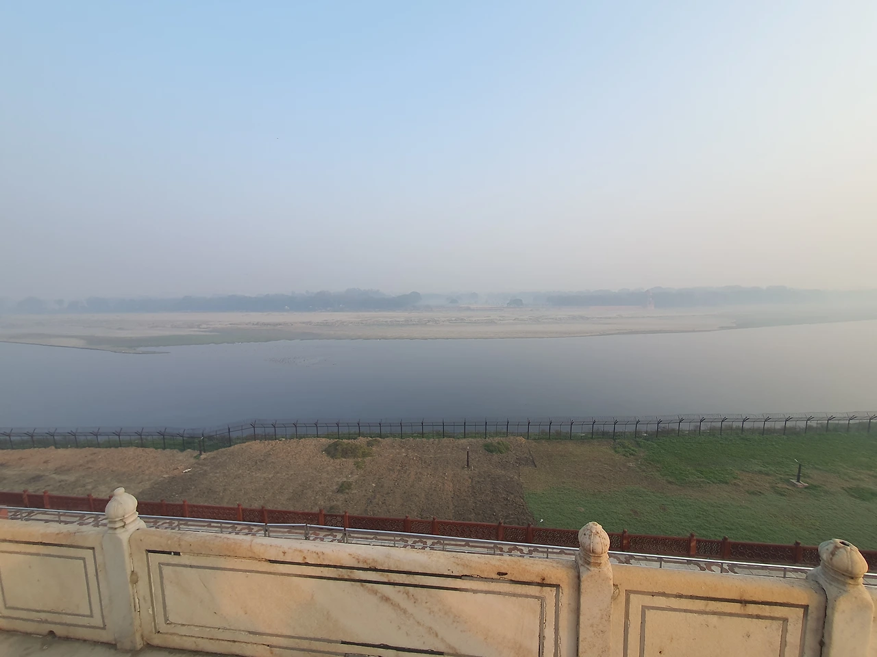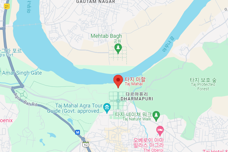타지마할의 위치는 꽤나 상징적인데, 가이드에 설명에 의하면 이슬람의 상징인 달과 별을 형상화했다고 말해줬다. 즉 야무나 강이 초승달의 형상, 별이 타지마할이라는 것이다. 들을 때는 꽤 그럴듯하다고 느꼈는데 지도를 보니 야무나 강의 곡률이 조금 맞지 않는 것 같기도 하다.