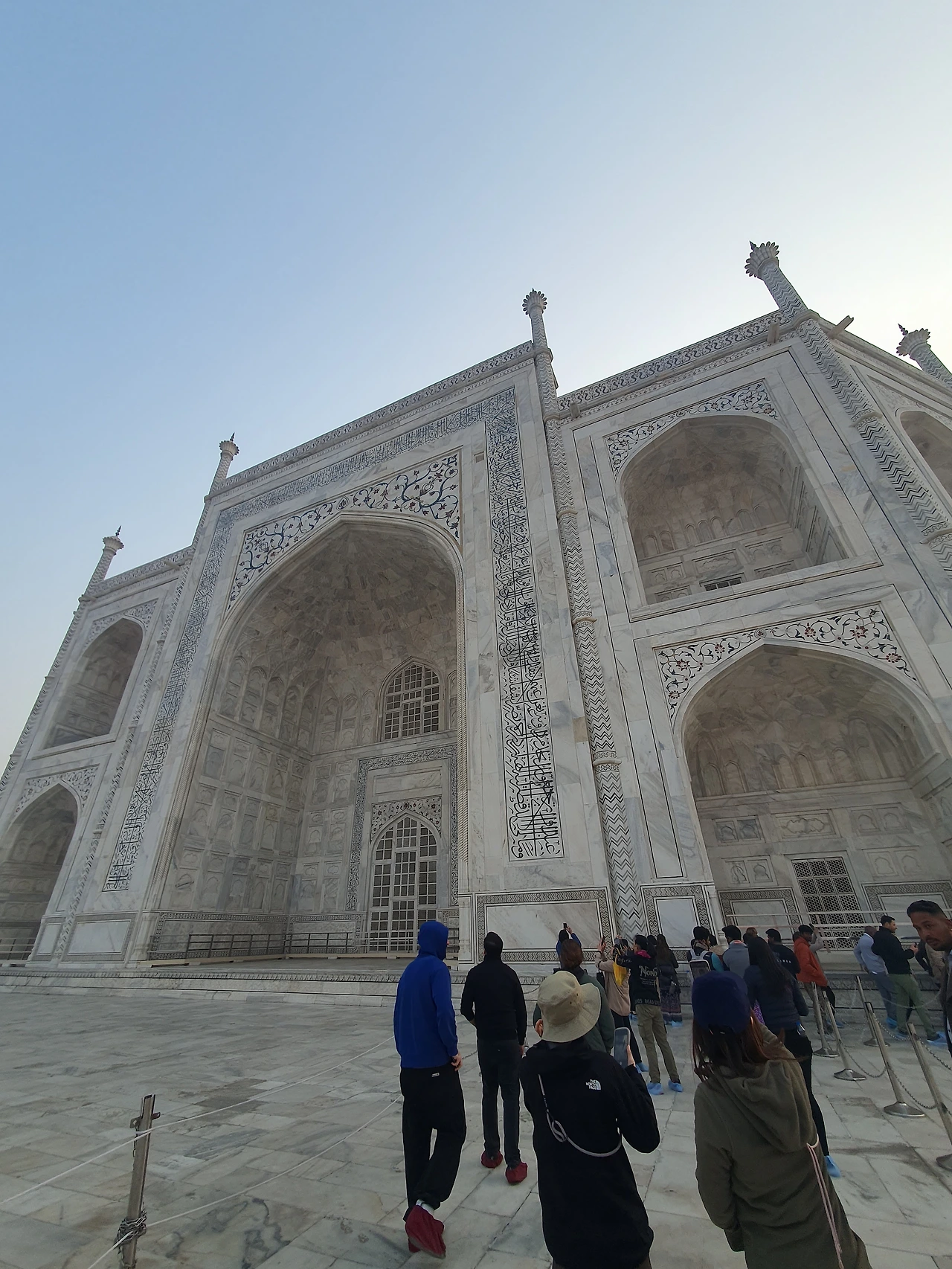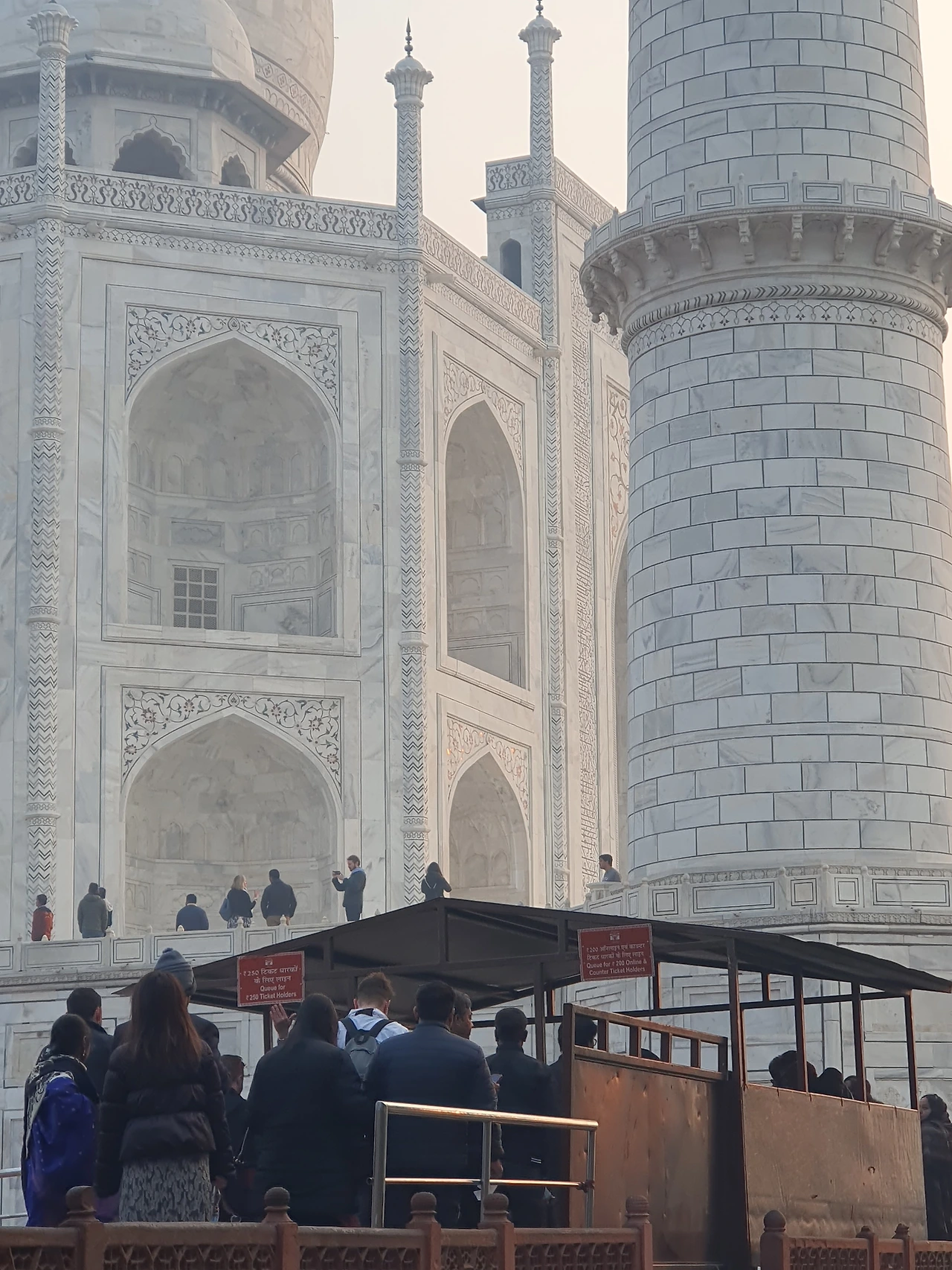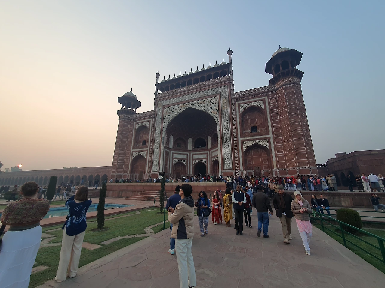새벽부터 일어나 도착한 타지마할 입구엔 이미 많은 관광객들이 즐비해있었다. 어스름하고 해가 뜨기 전 여명 속에서 타지마할 입구에 도착했다. 모든 게 완벽했다. 타지마할의 입구인 파라다이스 게이트가 액자가 되어 그 안으로 보이던 타지마할의 아름다움은 너무나도 황홀했고, 가이드가 설명해주던 파라다이스 게이트의 의미는 감동적이었지만 듣는 내내 무척 배가 아파졌다.