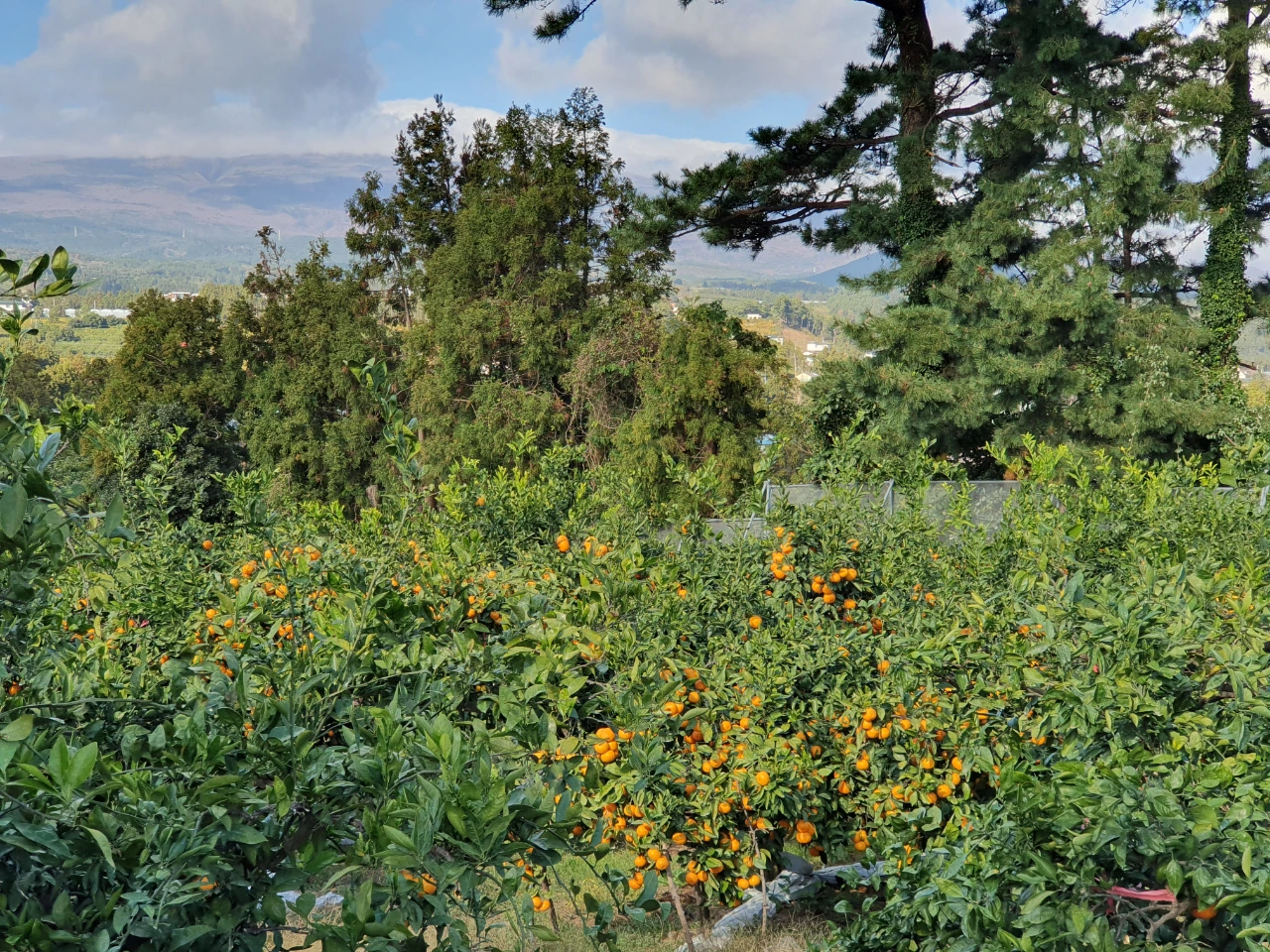 그런데 우리는 내린 곳에서 귤을 사 먹고, 제주시와는 달리 청명한 서귀포시의 날씨, 그리고 하필이면 한라산을 조망할 수 있는 곳에 딱 내리게 되어서 조금 그 순간을 만끽했다. 감귤나무와도 다정한 사진을 남기고.