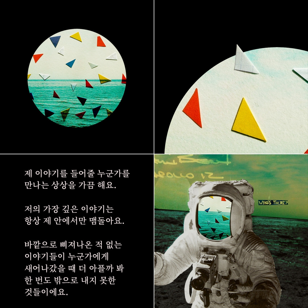 이 사연은 사건 중심이 아니라 외로움이라는 감정이 중심이고, 따라서 그 감정을 콜라주로 시각화해보고 싶었다. 내가 가장 힘들었던 순간들을 온 우주에서 나만 알고 있는 기분은 어떤 기분일까. 어떤 조각들이 행성 안에서 계속 돌아다니는 모습을 상상했다. 조각들은 때때로 잠식되기도 하고, 부유하기도 하고, 떠오르기도 한다. 뾰족한 조각들은 행성의 맨 바깥에 닿으면 따끔한 상처를 낸다. 그 행성에는 아무도 없다.
